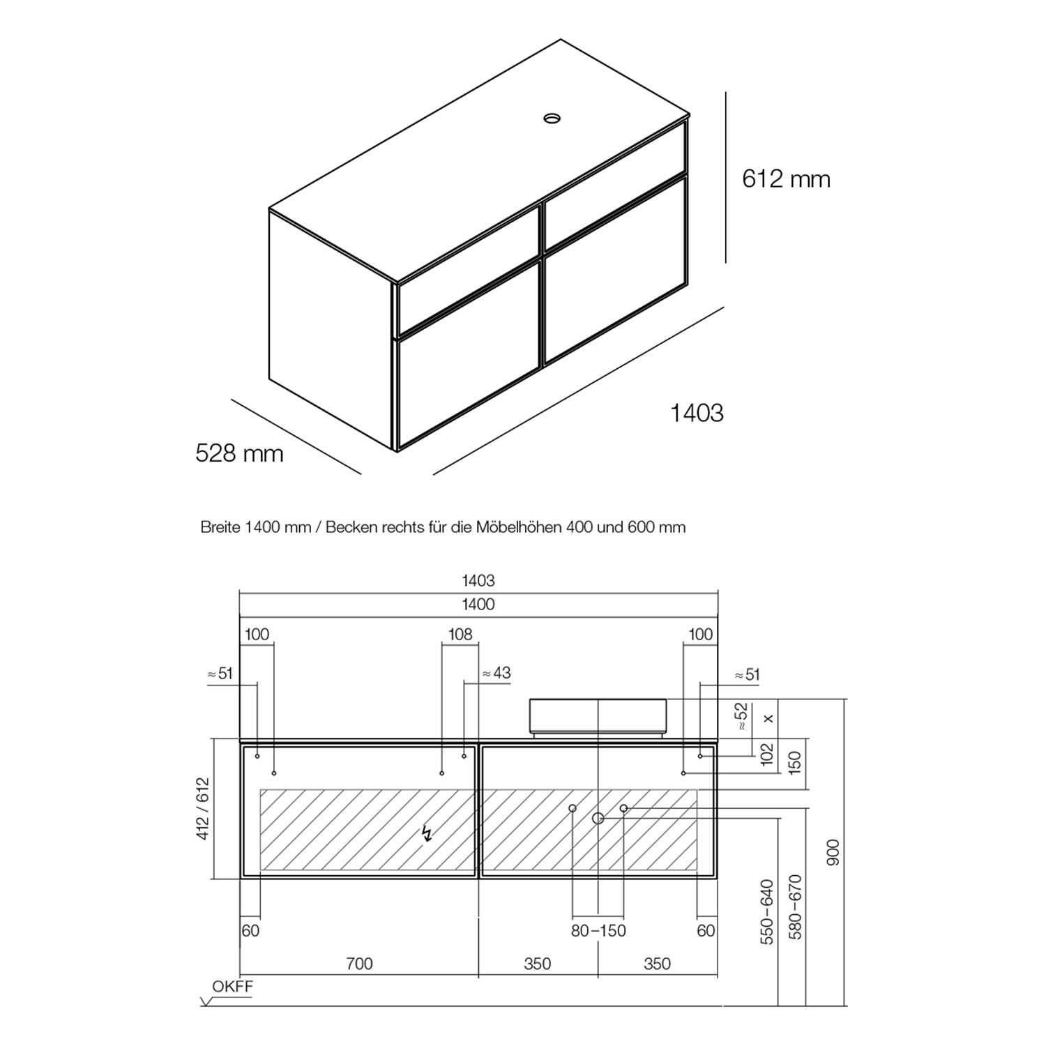 Alape Arkta Möbelmodul mit Trägerplatte 140 cm, Beckenposition rechts