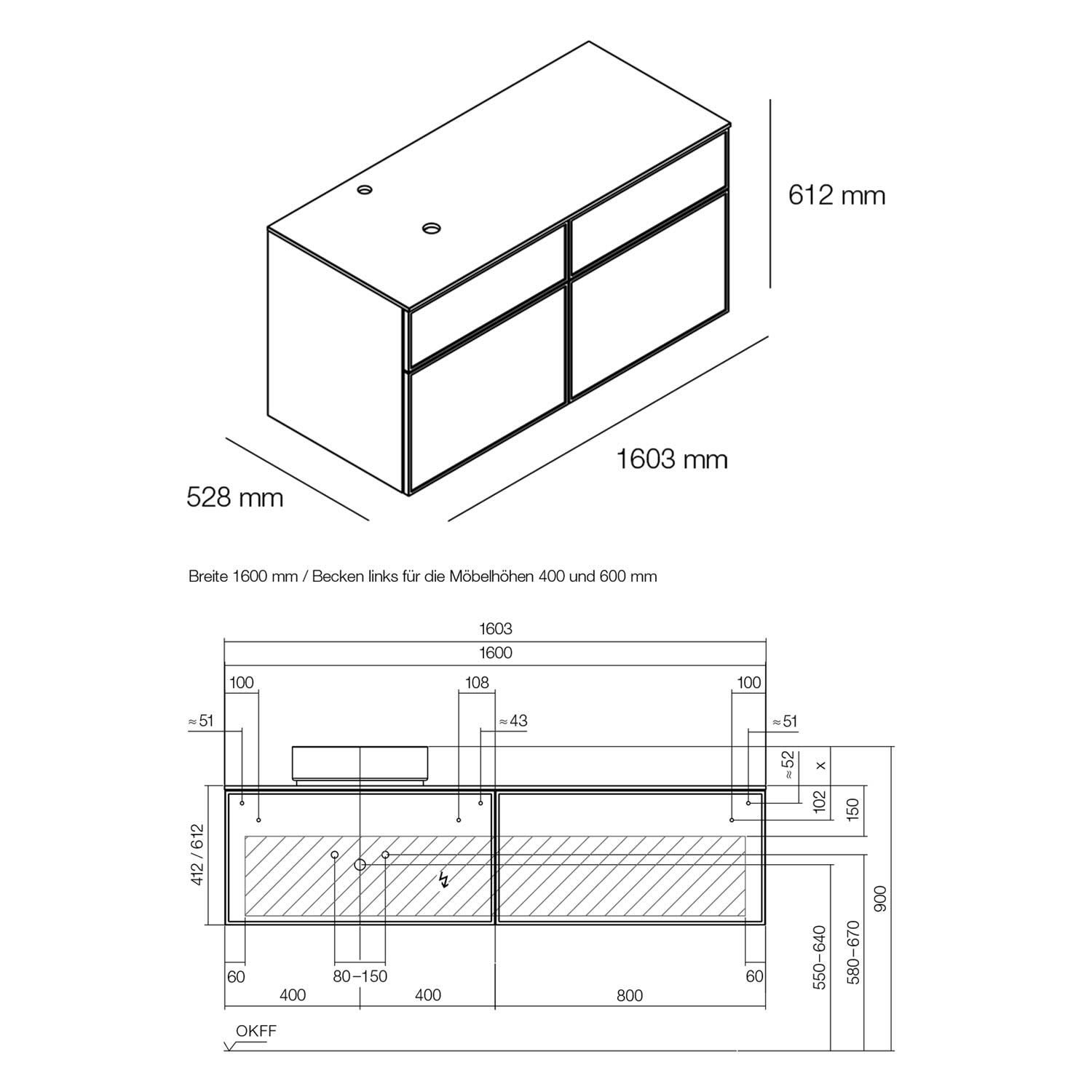Alape Arkta Möbelmodul mit Trägerplatte 160 cm, Beckenposition links