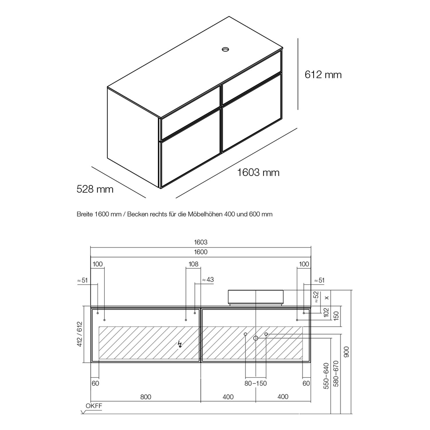 Alape Arkta Möbelmodul mit Trägerplatte 160 cm, Beckenposition rechts