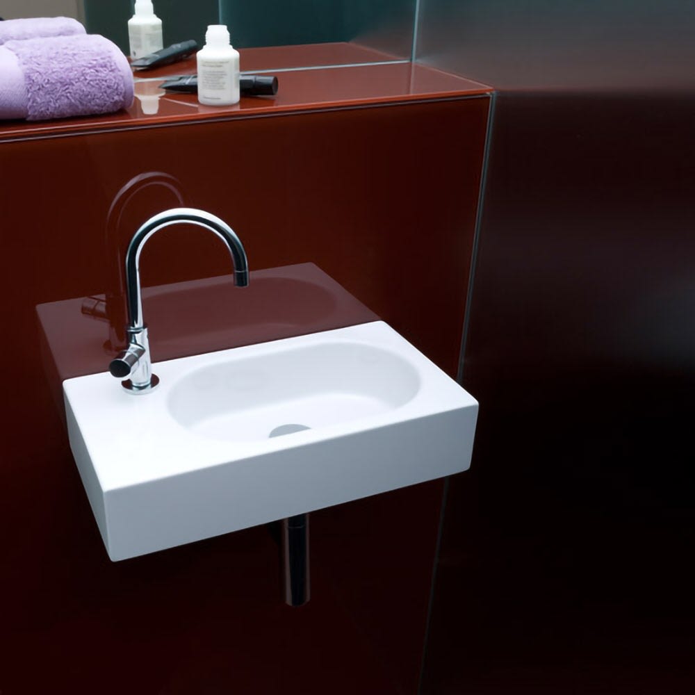 Modell WT.XXS450H.RMit einer Tiefe von nur 24 Zentimetern fügt sich der Waschtisch sogar in Kleinstbäder ein. Die ovale Beckenmulde setzt einen ausgleichenden Akzent im ansonsten rechteckigen Design. Auch als Waschplatzvariante mit Handtuchhalter und integriertem Ablagefach für Stauraum erhältlich.