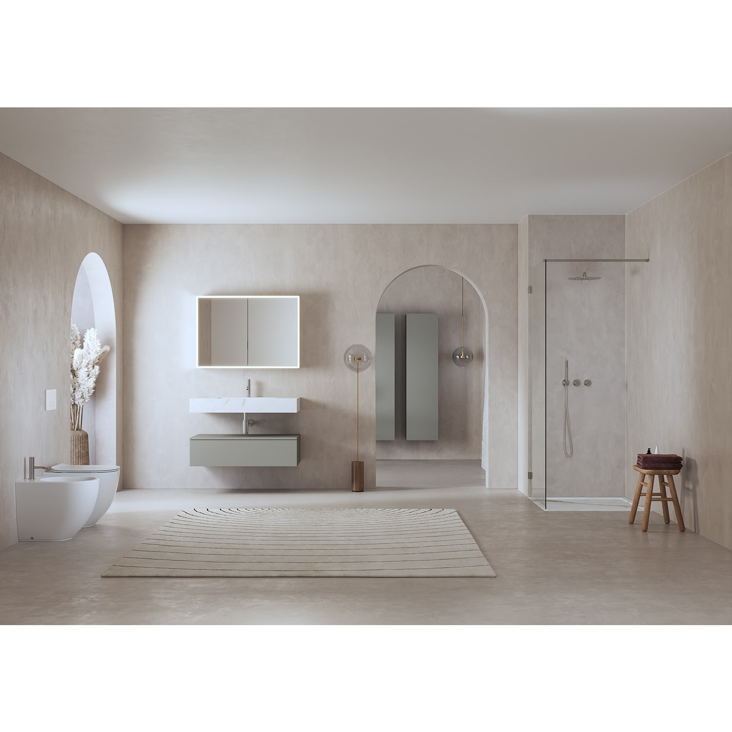 - Gestaltungsfreiheit: ohne Beckenausschnitt passend zu individuell ausgewähltem Waschtisch.