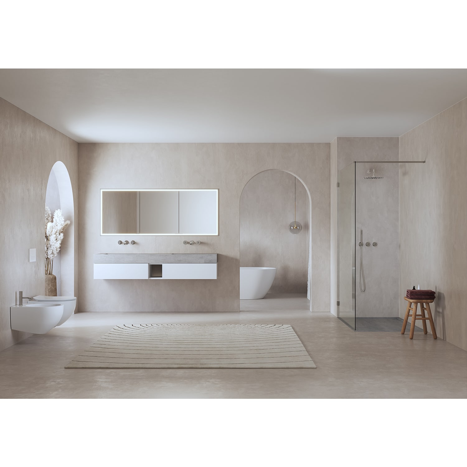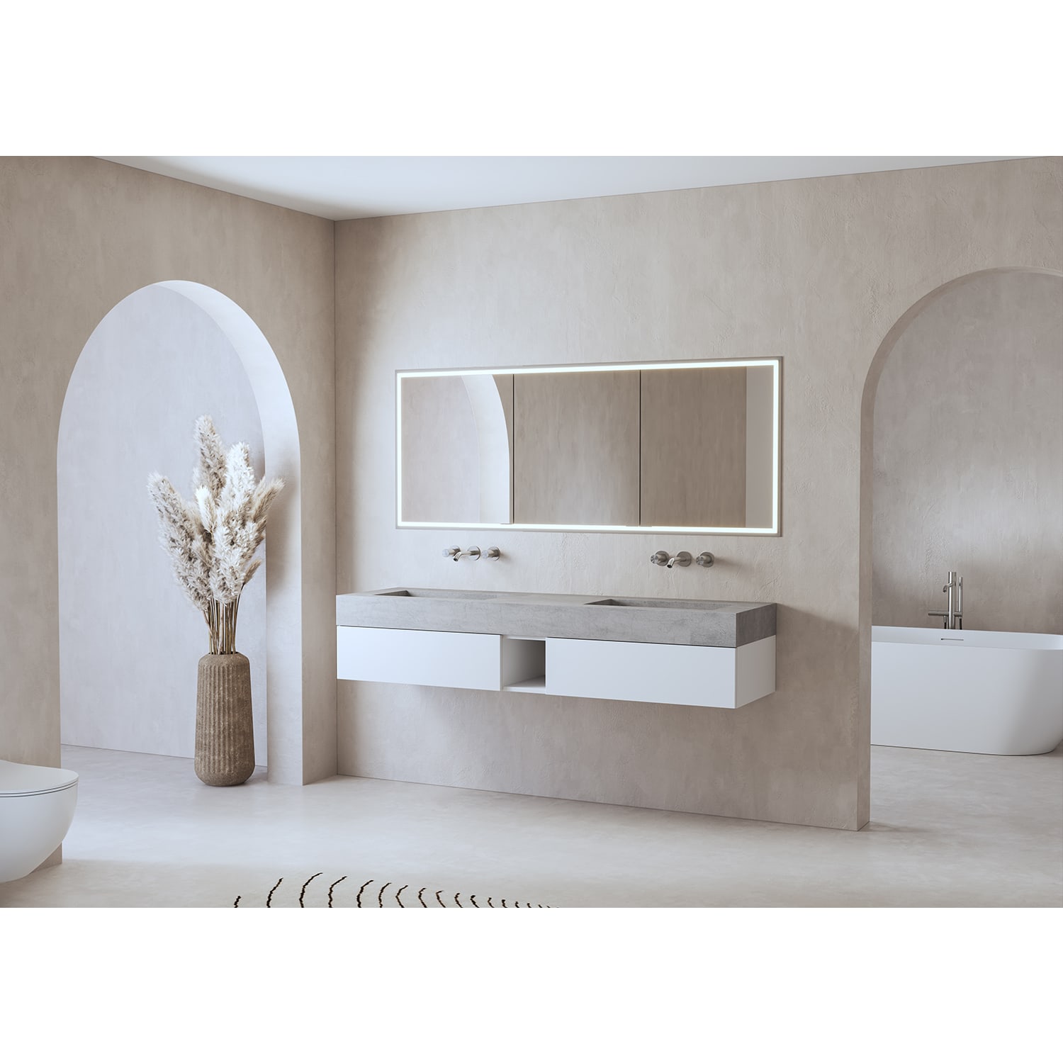 Minimalistisches Masterbad: Die Alluvion-Badmöbel sind auch in zwei Größen mit Doppelwaschtisch erhältlich, um maximale Kompatibilität zu gewährleisten.