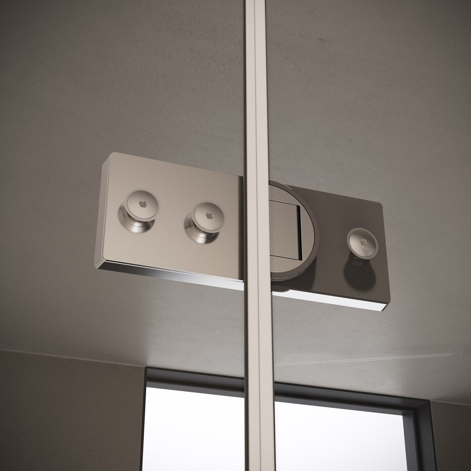 - rahmenlose Tür mit einem Glasflügel, nach innen und außen öffnend, mit einem festem Segment, Nebenteil und rahmenloser Seitenwand