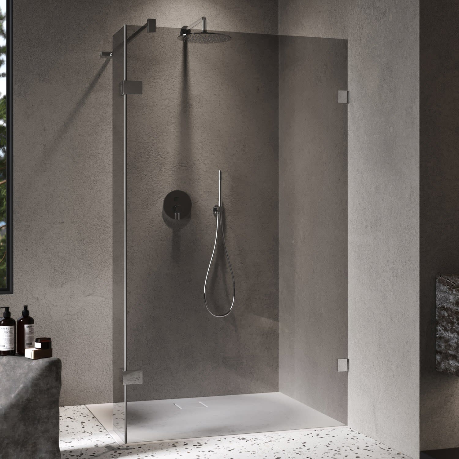 - rahmenlose Walk-In-Glasanlage mit beweglichem Segment nach innen und außen öffnend