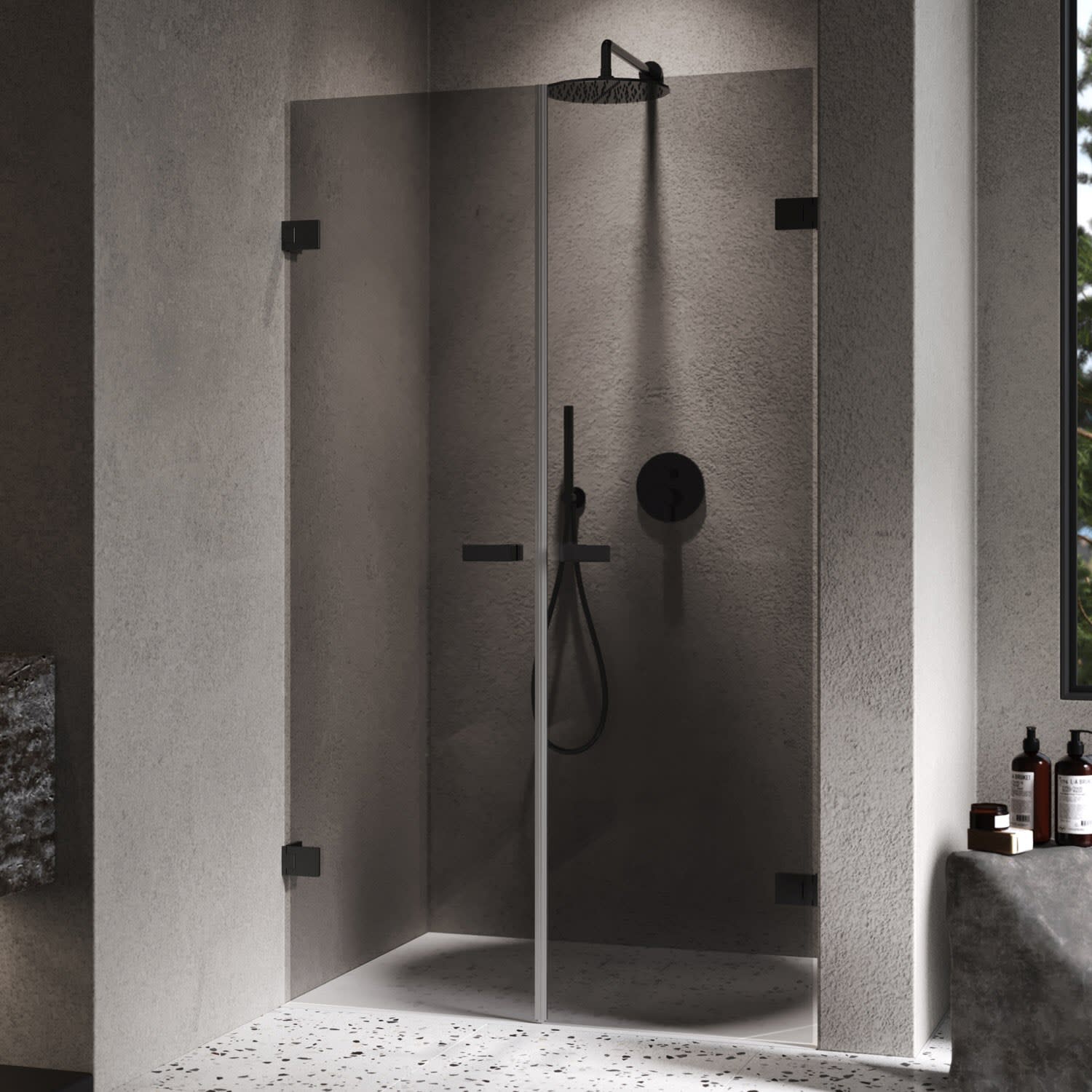 - rahmenlose Tür mit zwei Glasflügeln, nach innen und außen öffnend