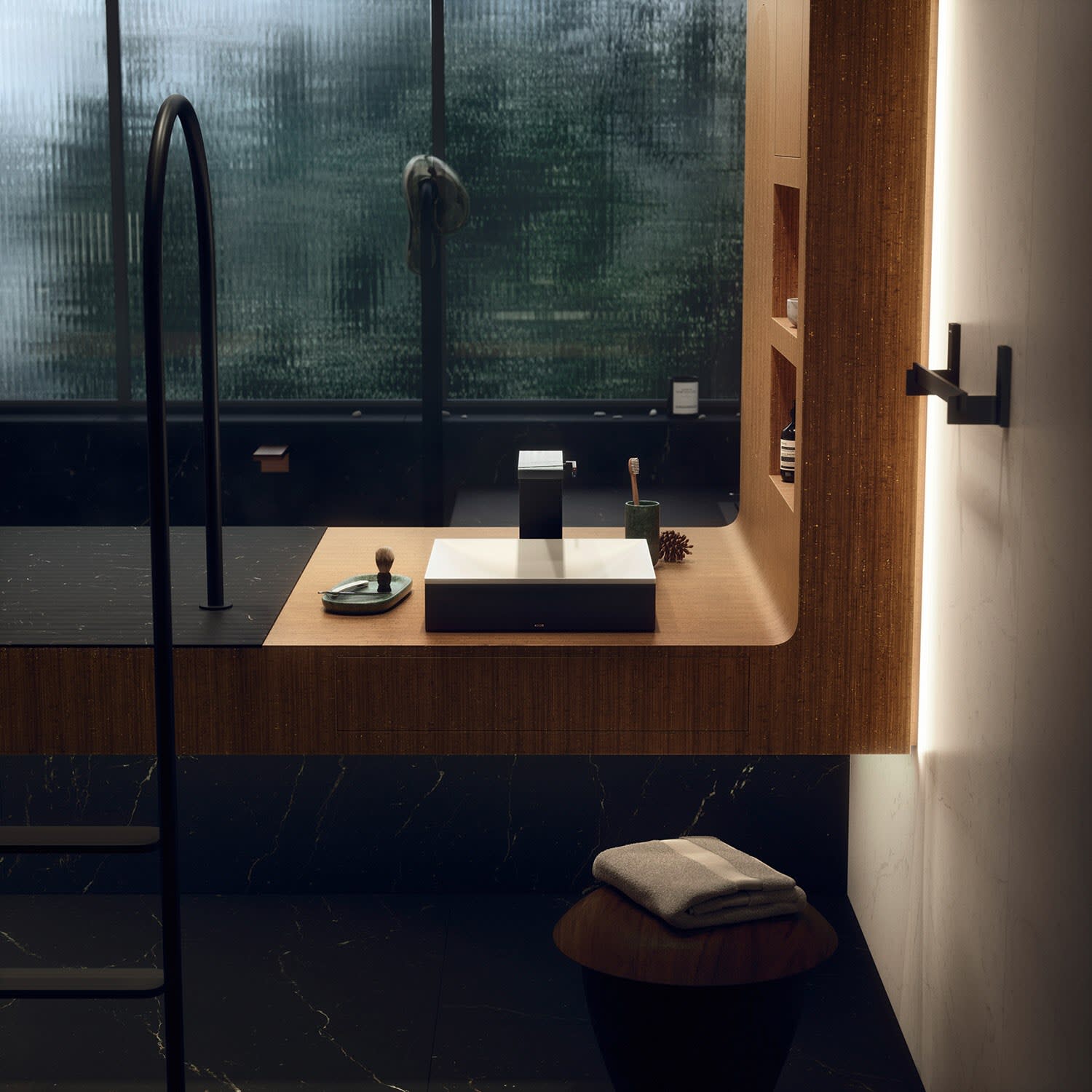 - ohne Hahnloch – für wandmontierte oder freistehende Armaturen geeignet