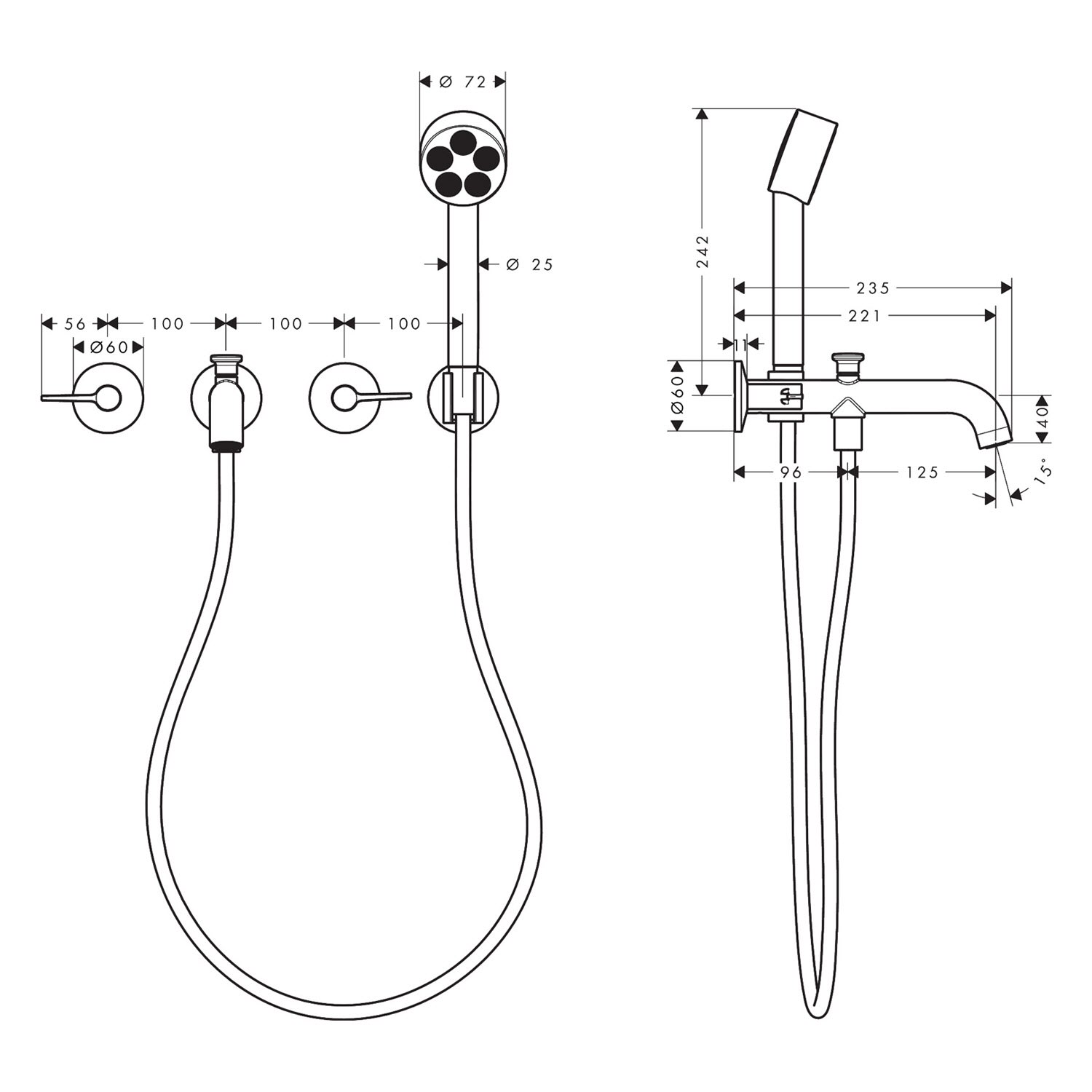 Dornbracht TARA Wannenbatterie für Wandmontage mit Schlauchbrausegarnitur