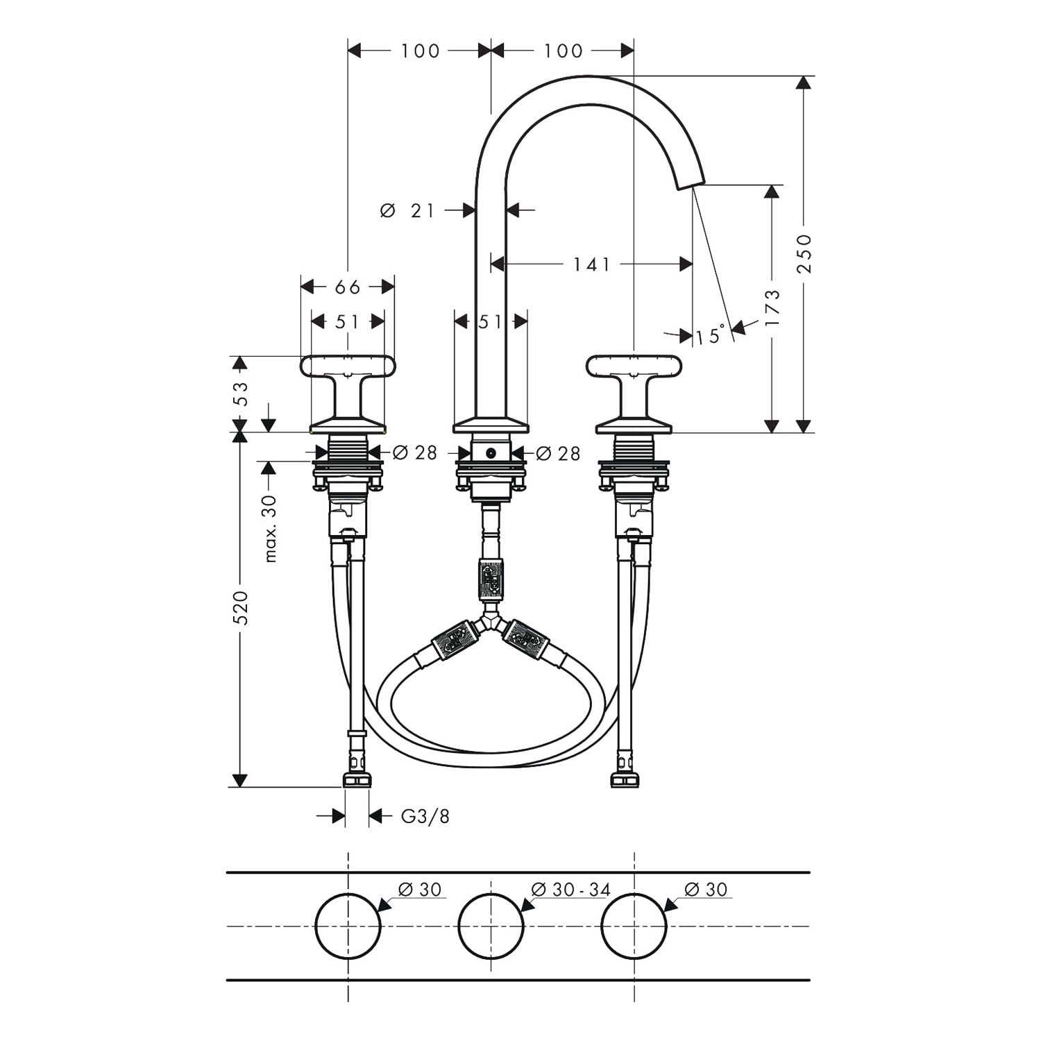 - 3-Loch Waschtischarmatur, Ablaufgarnitur,Schaftbefestigung, Anschlussschläuche, Montageschlüssel