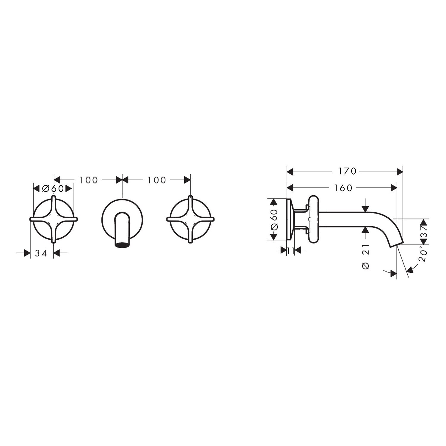 AXOR One 3-Loch Waschtischarmatur UP für Wandmontage mit Kreuzgriffen und Auslauf 16 cm