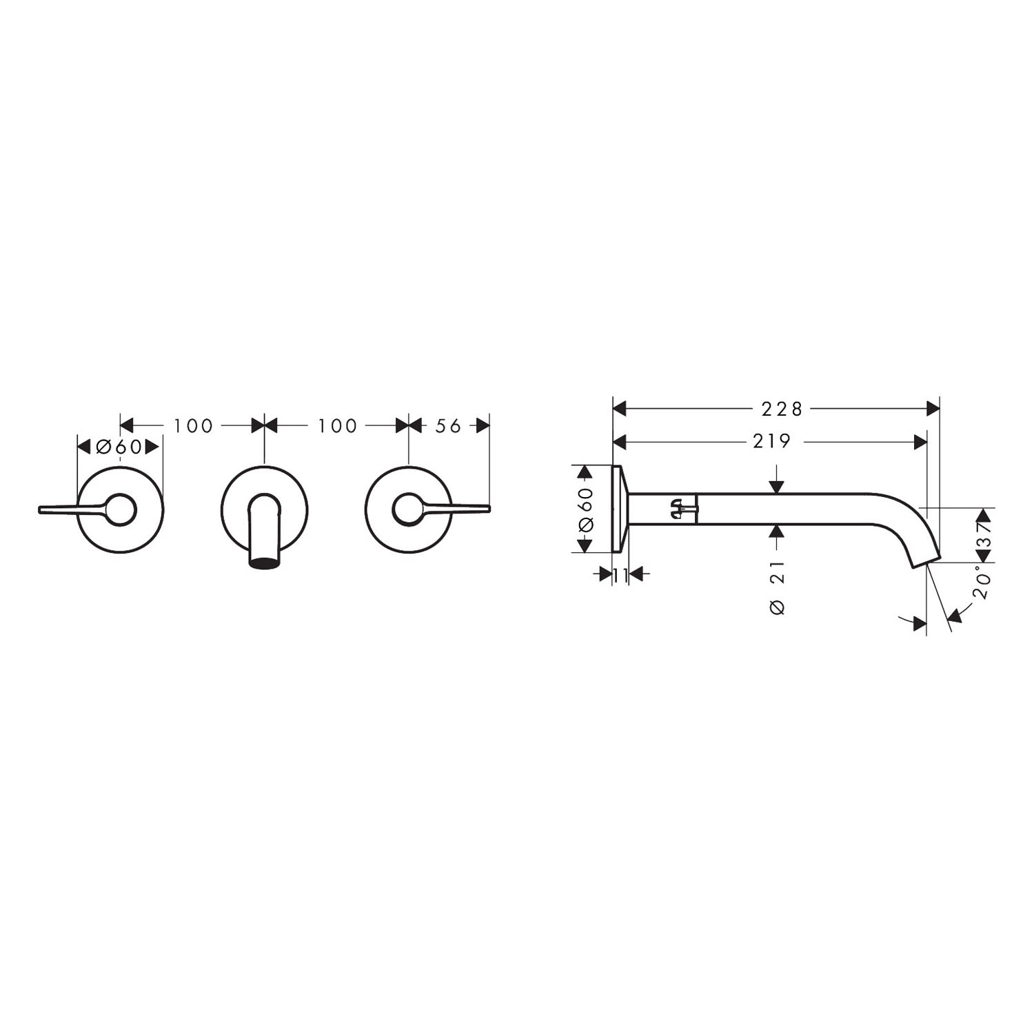 AXOR One 3-Loch Waschtischarmatur UP für Wandmontage mit Hebelgriffen und Auslauf 22 cm