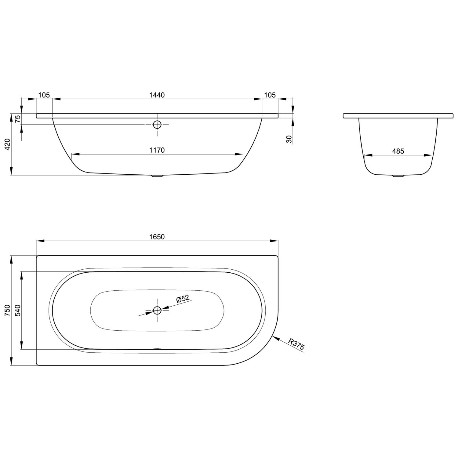 - rechteckige Stahlbadewanne mit einer abgerundeten Ecke