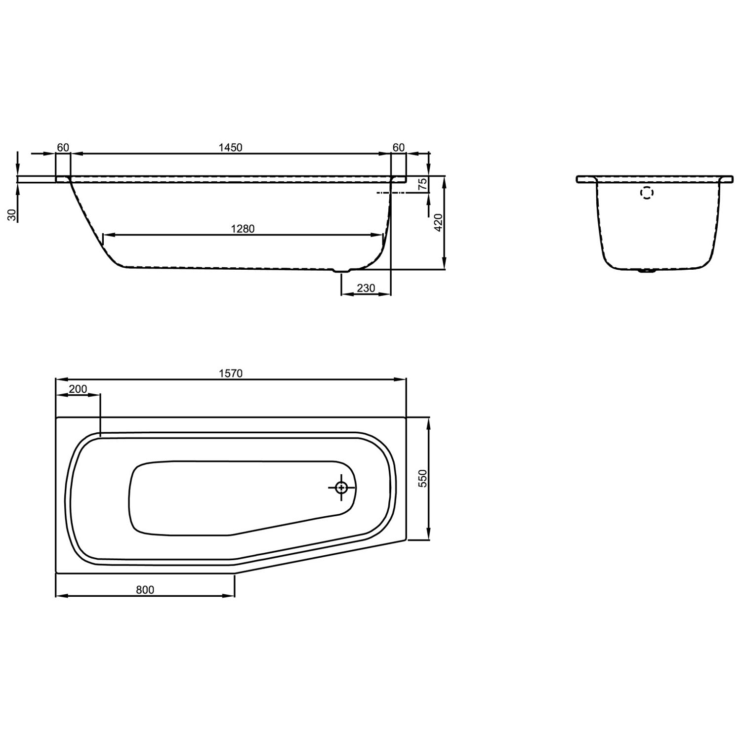 - Stahlbadewanne mit Schräge rechts (am Fussende)