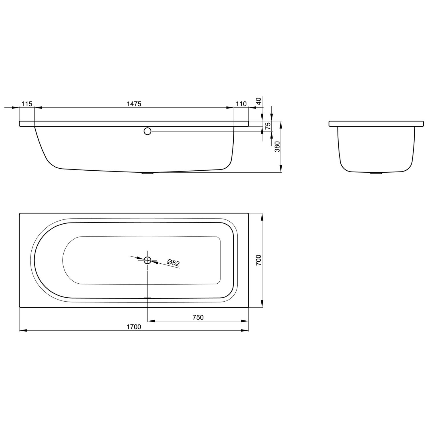 - Stahlbadewanne mit schmalem Rand und den Maßen 170 x 70 x 38 cm für ca. 125 Liter Wasser nebst einem Badenden