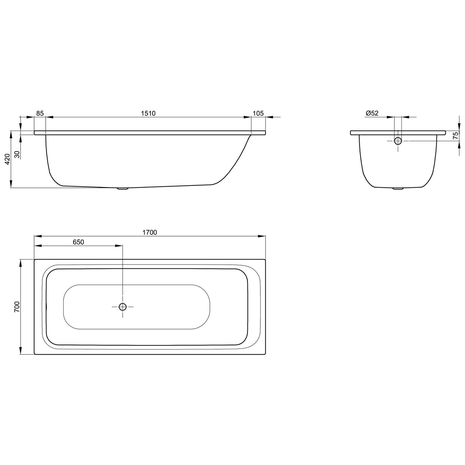 Bette Select Badewanne 170 x 70 x 42 cm Ablauf mittig