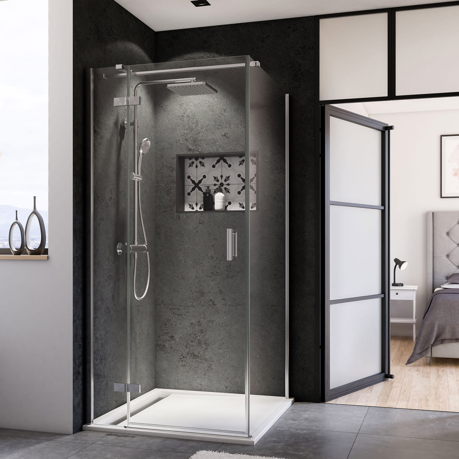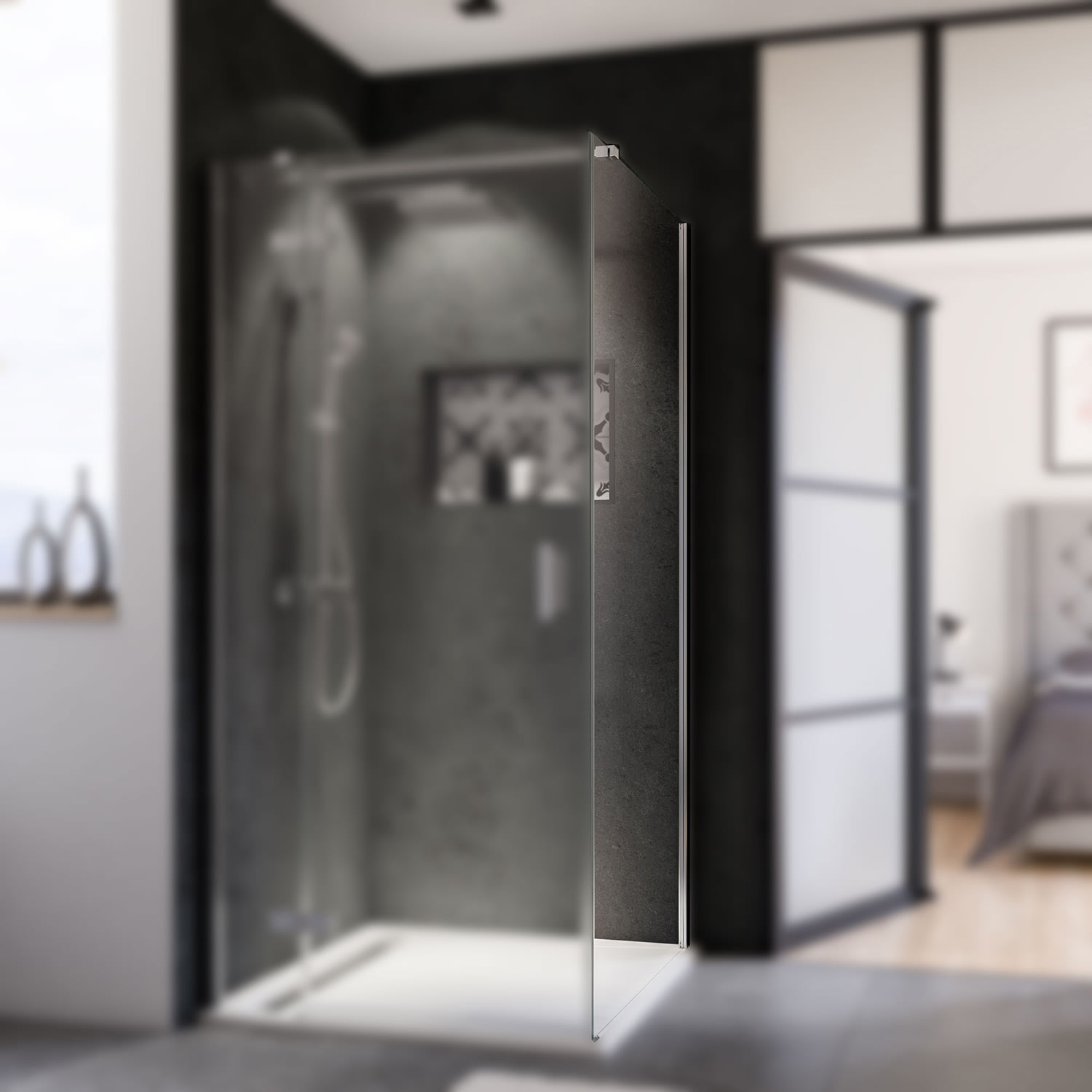Bitte die Drehtür mit Festteil für Seitenwand separat bestellen. Sie finden diese im Zubehör.