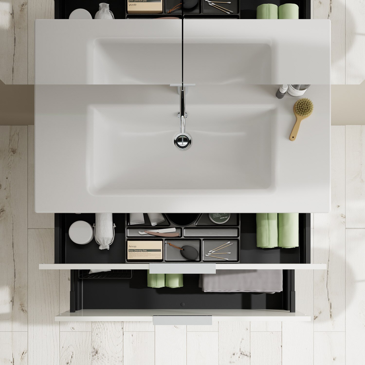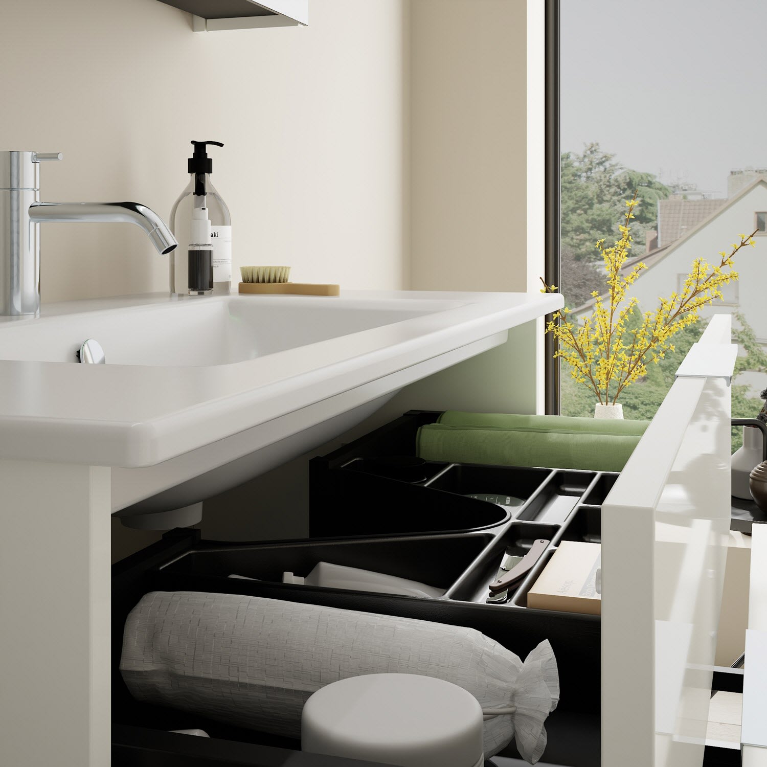 - 1 Schublade oben, 35 cm tief, mit Siphonausschnitt und Inneneinteilung