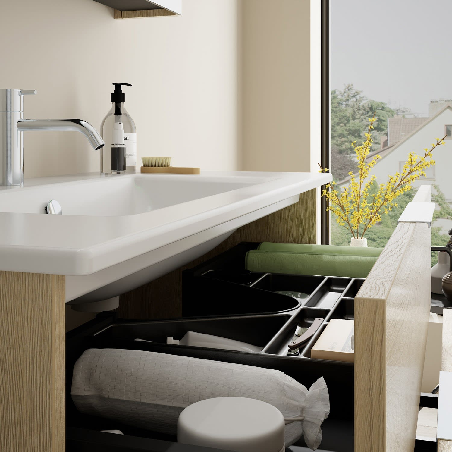 - 1 Schublade oben, 35 cm tief, mit Siphonausschnitt und Inneneinteilung