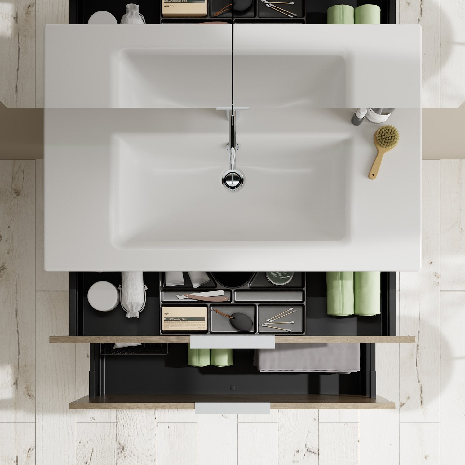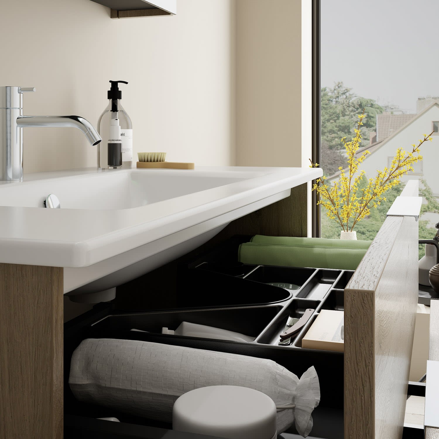 - 1 Schublade oben, 35 cm tief, mit Siphonausschnitt und Inneneinteilung