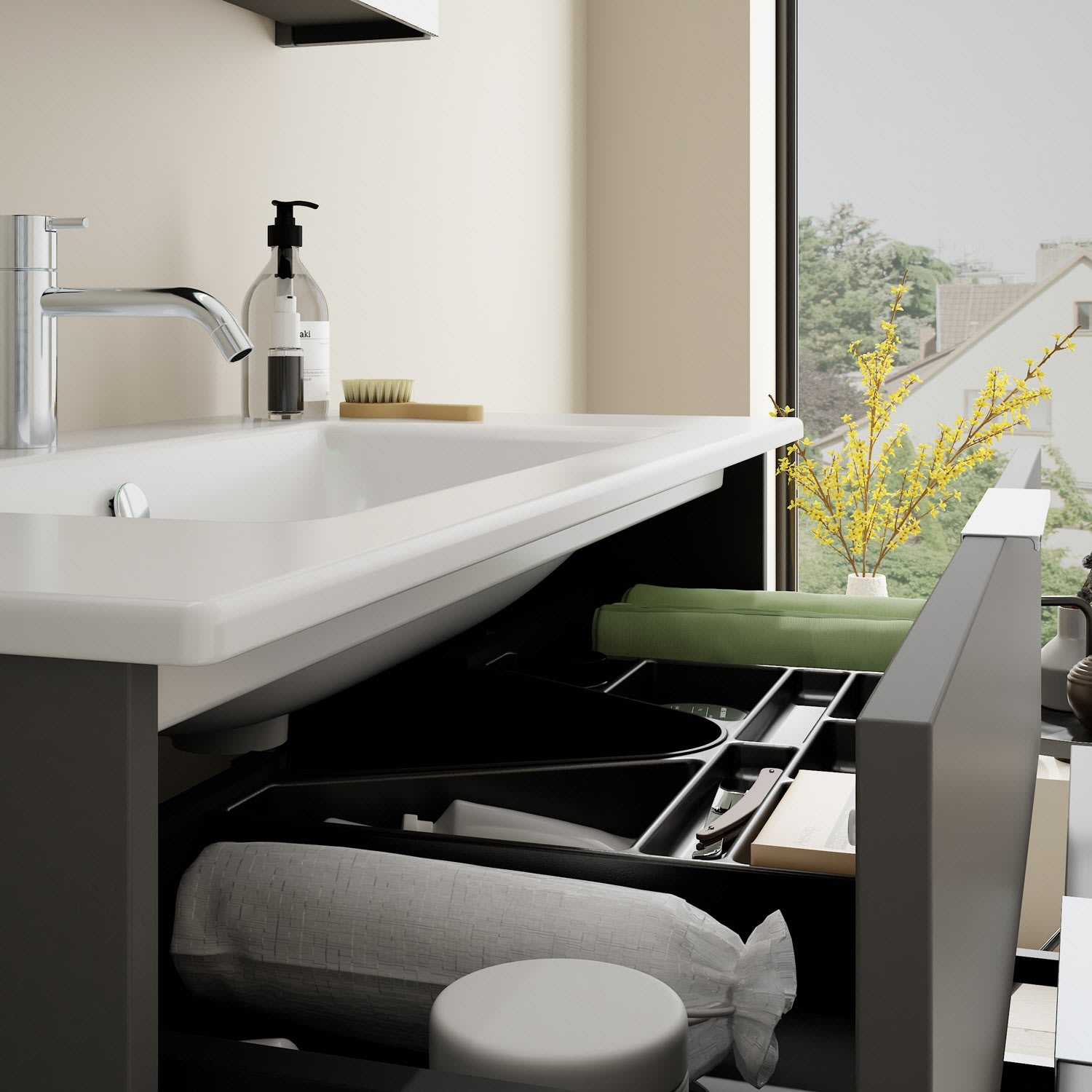 - 1 Schublade oben, 35 cm tief, mit Siphonausschnitt und Inneneinteilung
