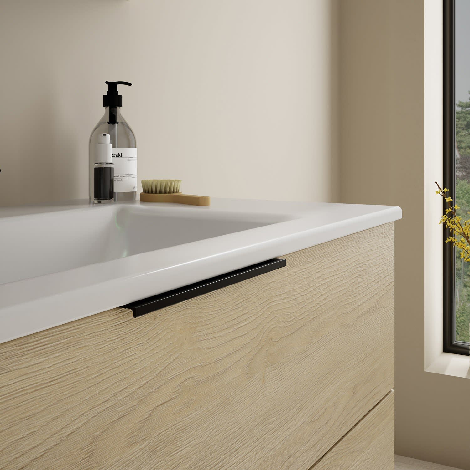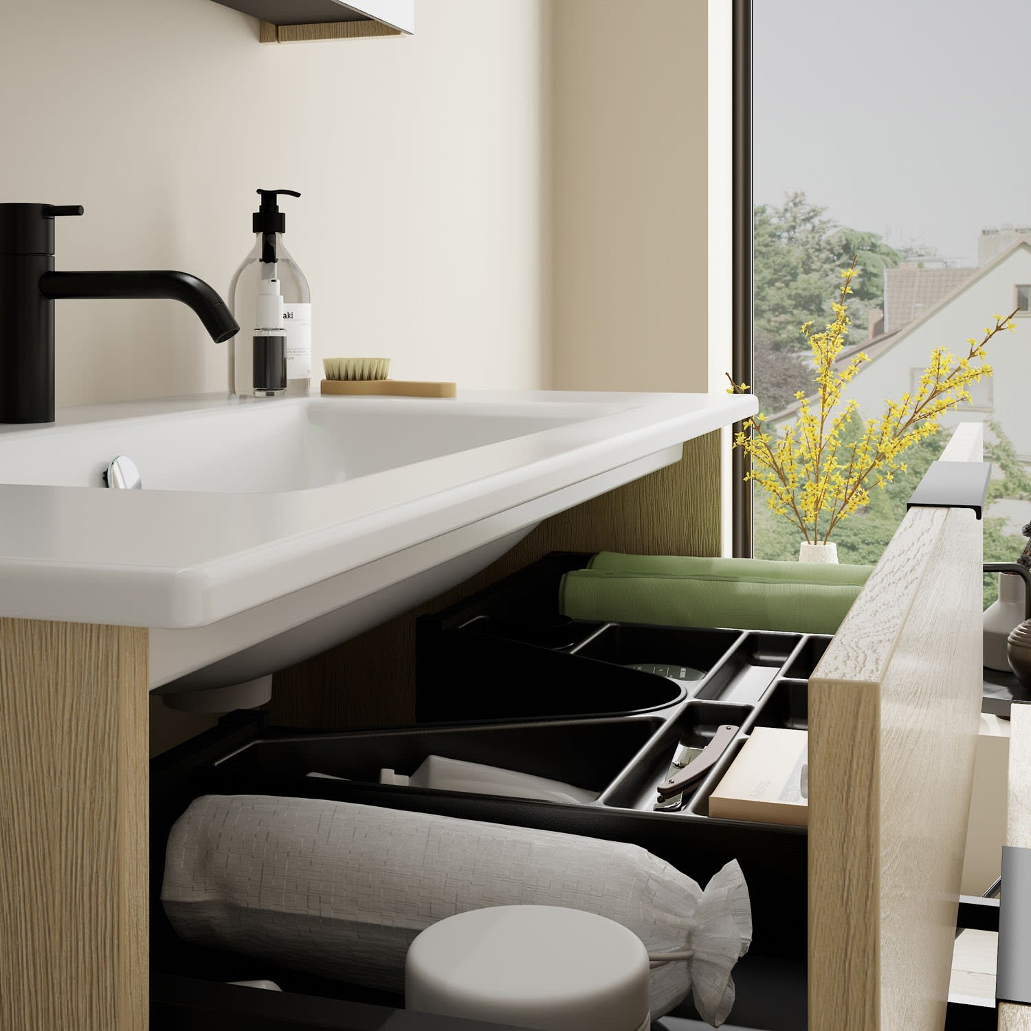 - 1 Schublade oben, 35 cm tief, mit Siphonausschnitt und Inneneinteilung