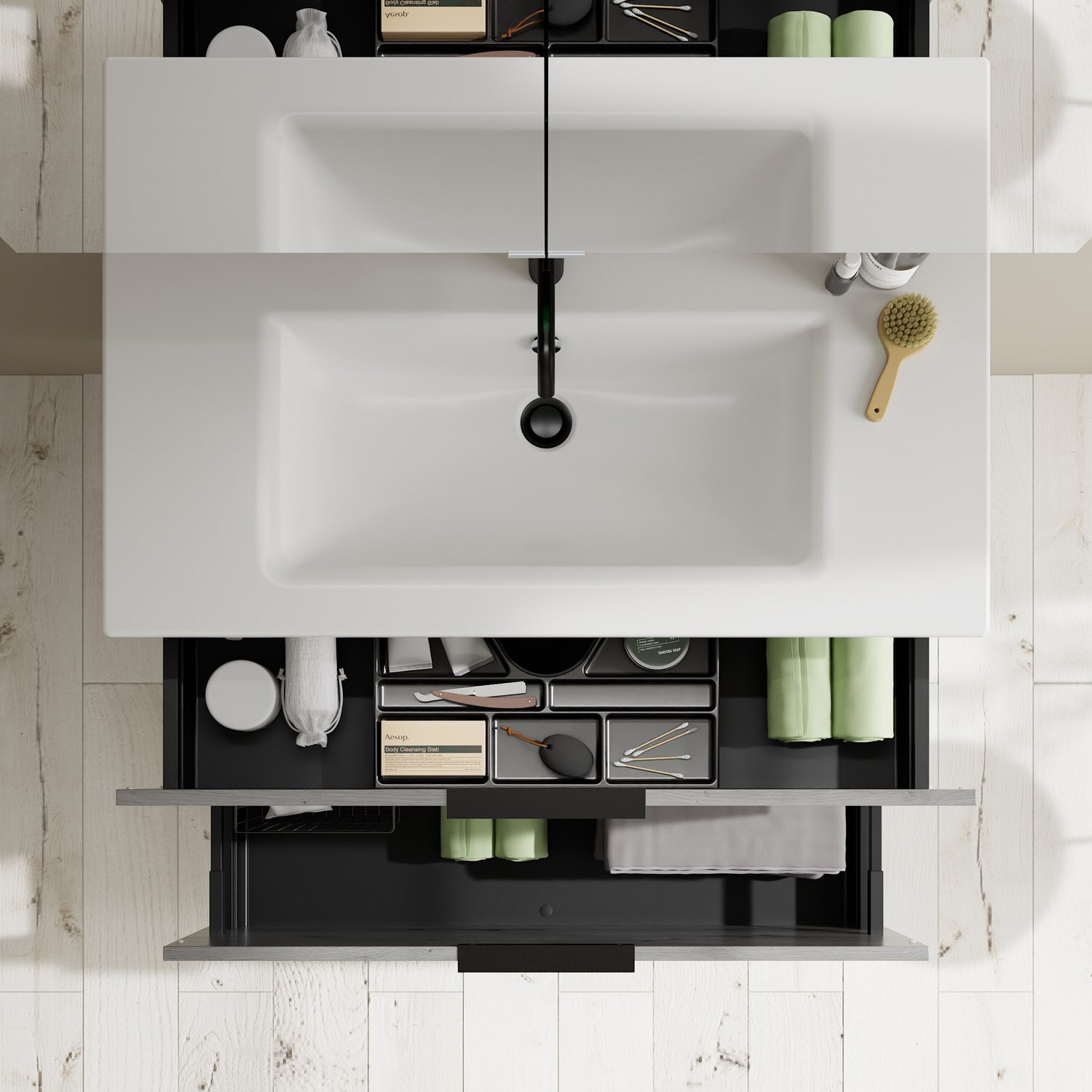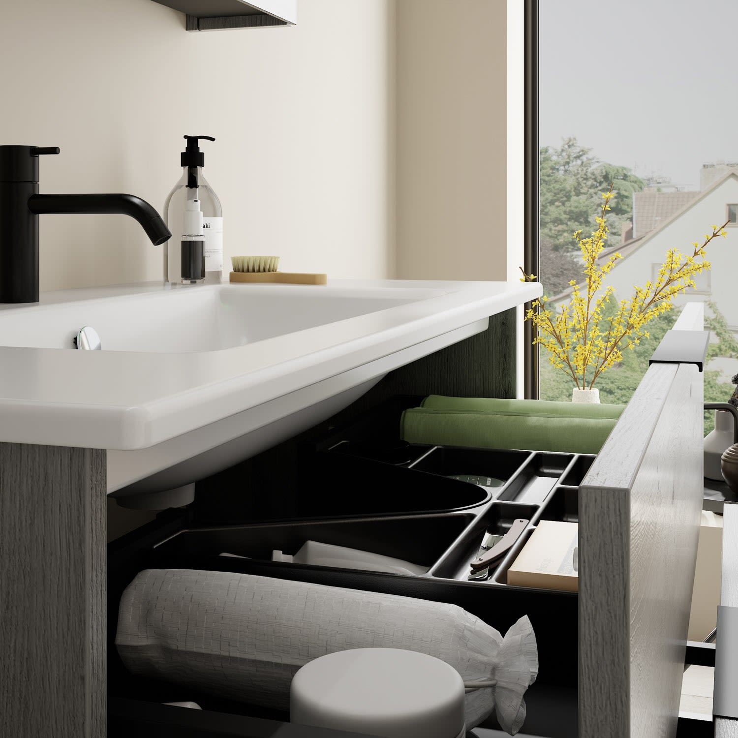 - 1 Schublade oben, 35 cm tief, mit Siphonausschnitt und Inneneinteilung