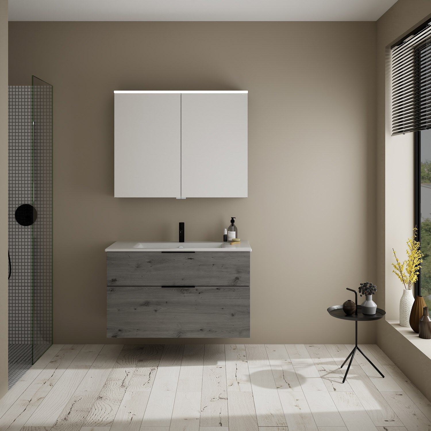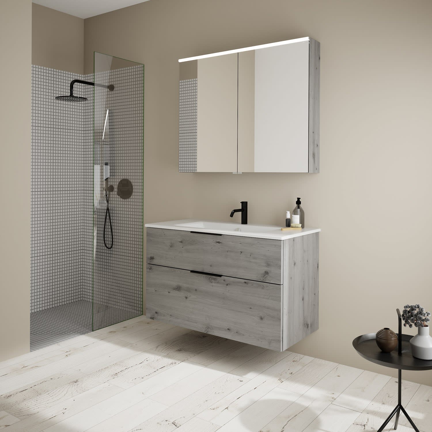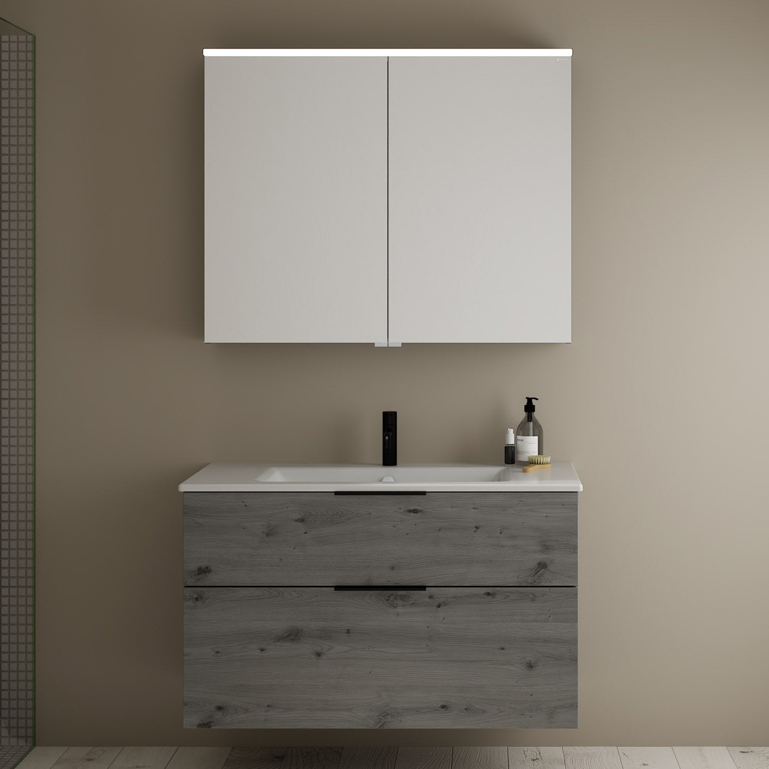 burgbad Eqio Badmöbel-Set 102 cm mit Keramik-Waschtisch Slim und Unterschrank mit Griff G0200, mit Spiegelschrank