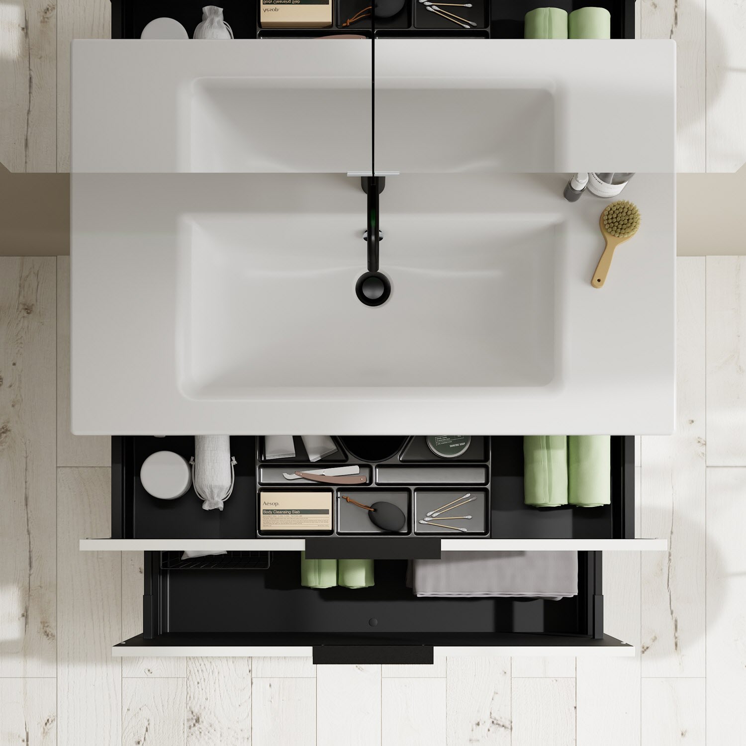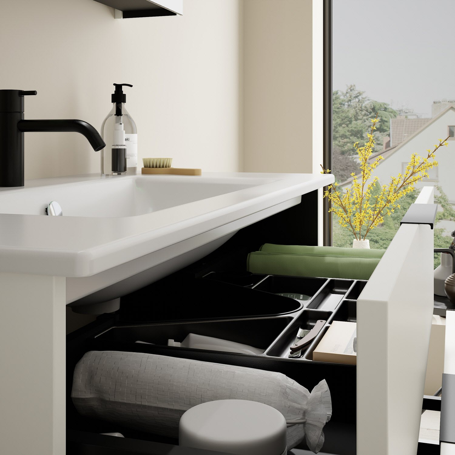 - 1 Schublade oben, 35 cm tief, mit Siphonausschnitt und Inneneinteilung