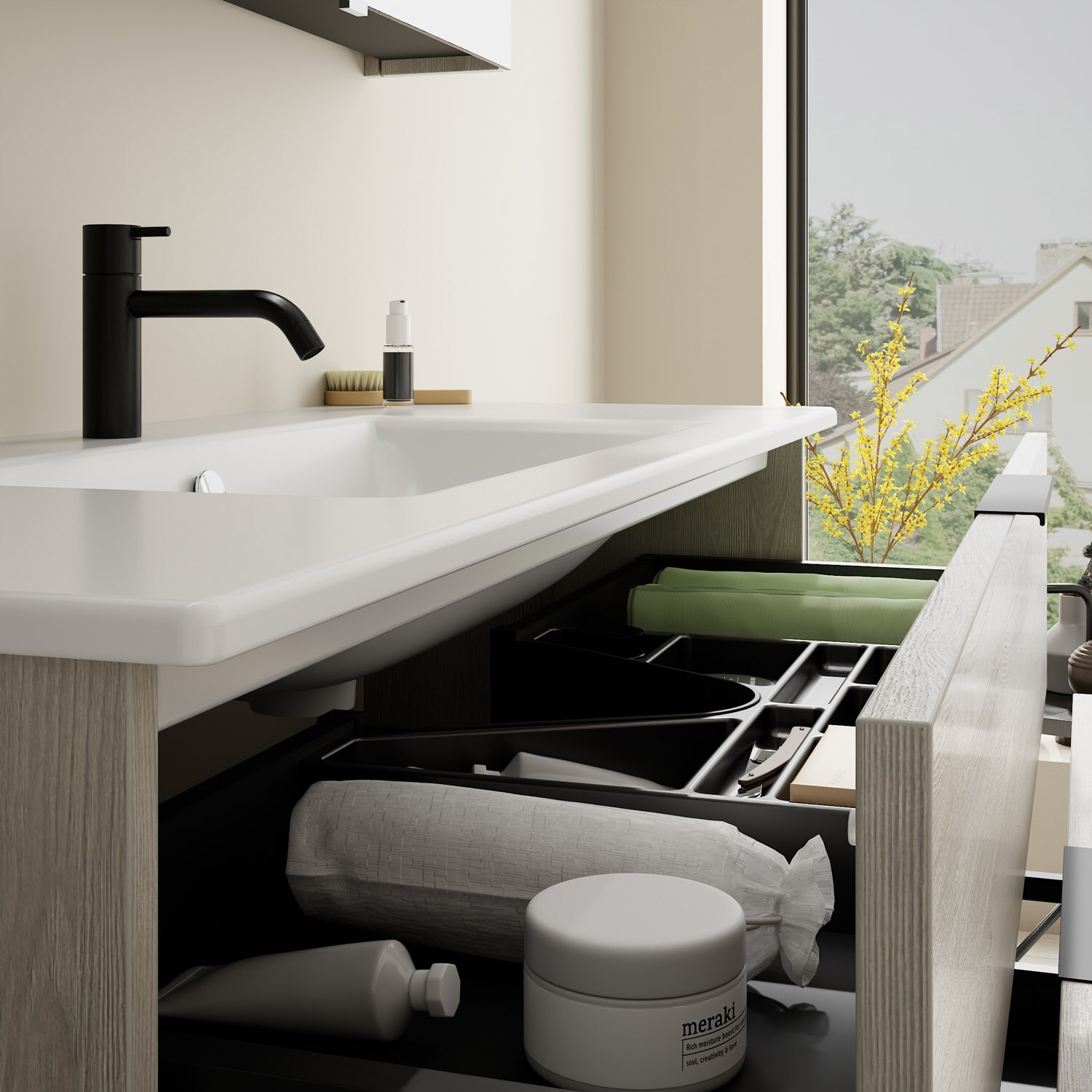 - 1 Schublade oben, 35 cm tief, mit Siphonausschnitt und Inneneinteilung