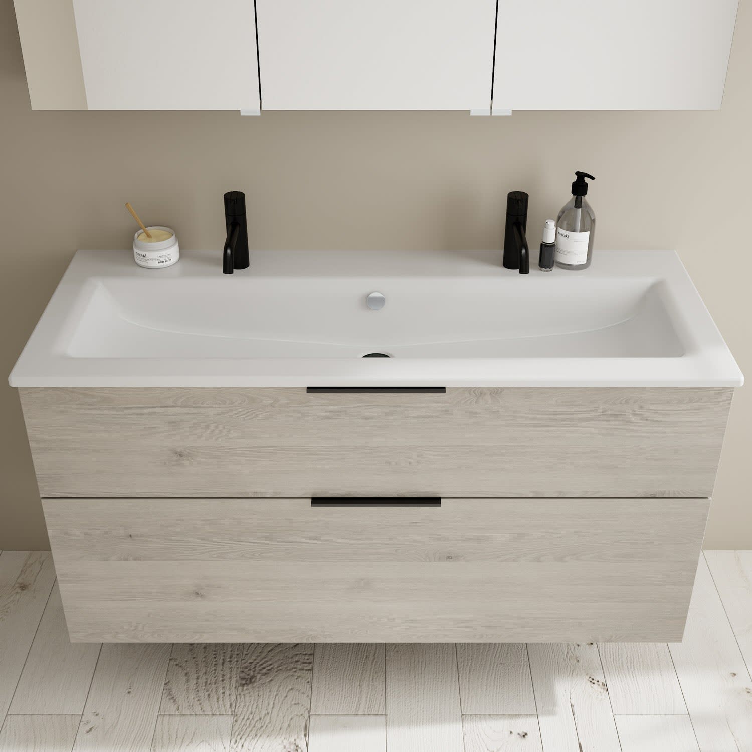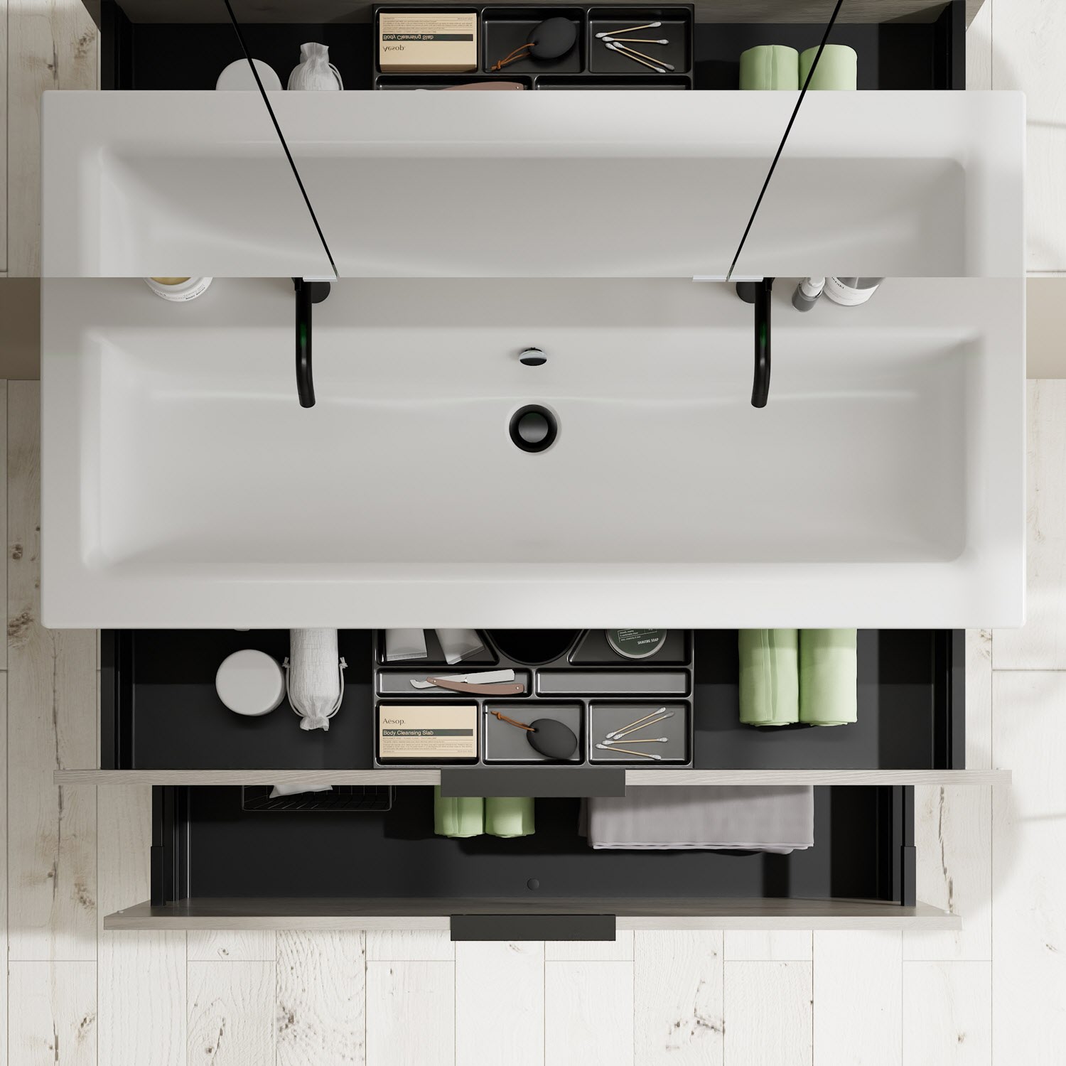 - 1 Schublade oben, 35 cm tief, mit Siphonausschnitt und Inneneinteilung