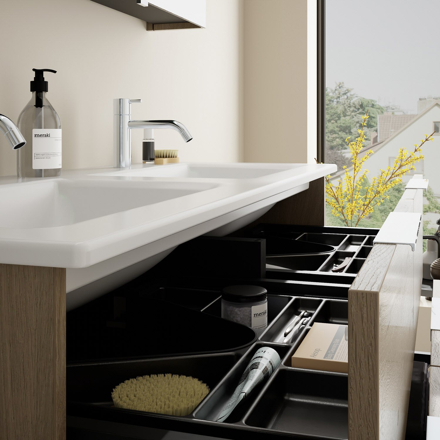 - 2 Schubladen oben, 35 cm tief, mit Siphonausschnitt und Inneneinteilung