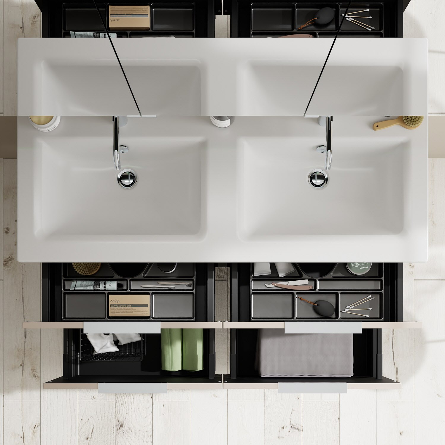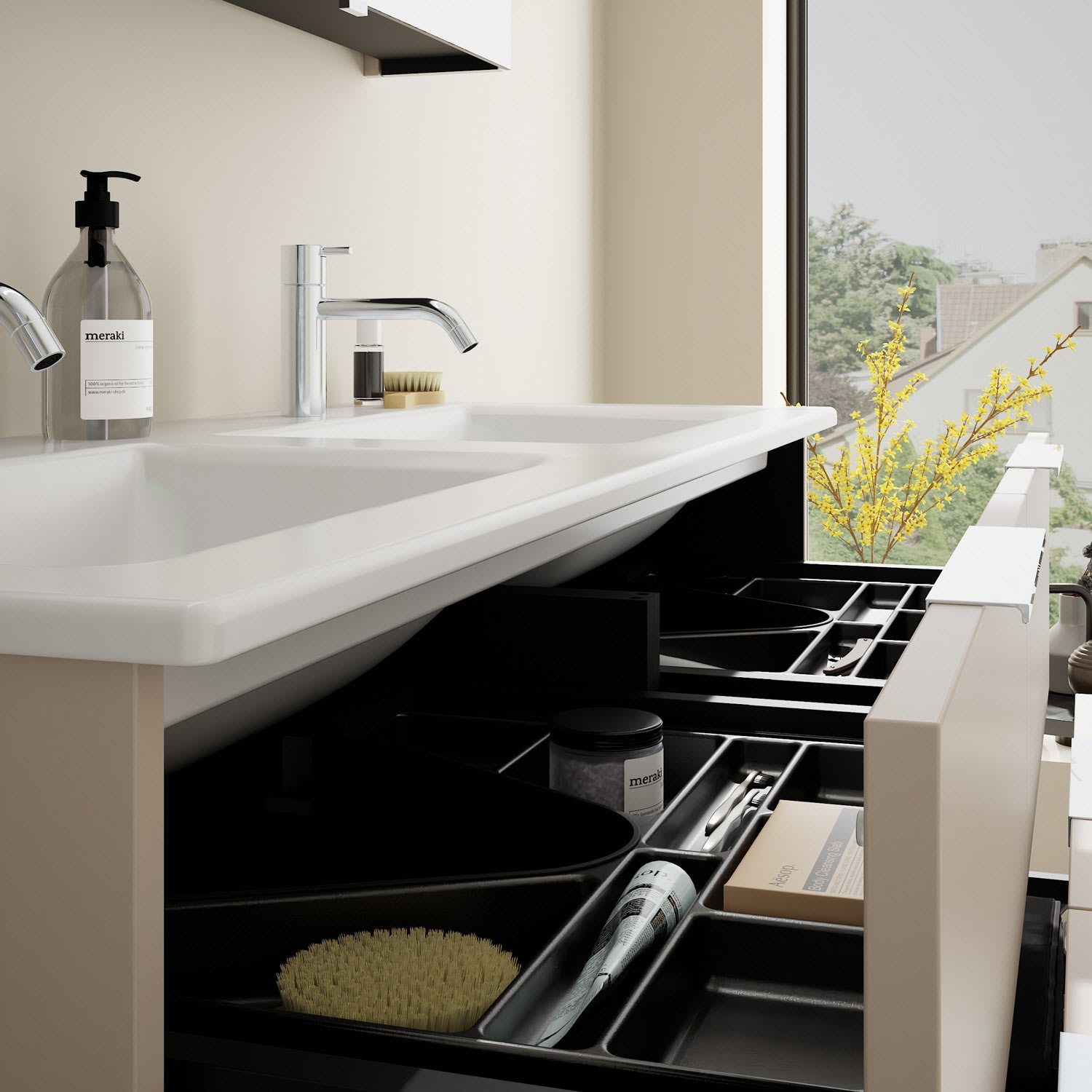 - 2 Schubladen oben, 35 cm tief, mit Siphonausschnitt und Inneneinteilung