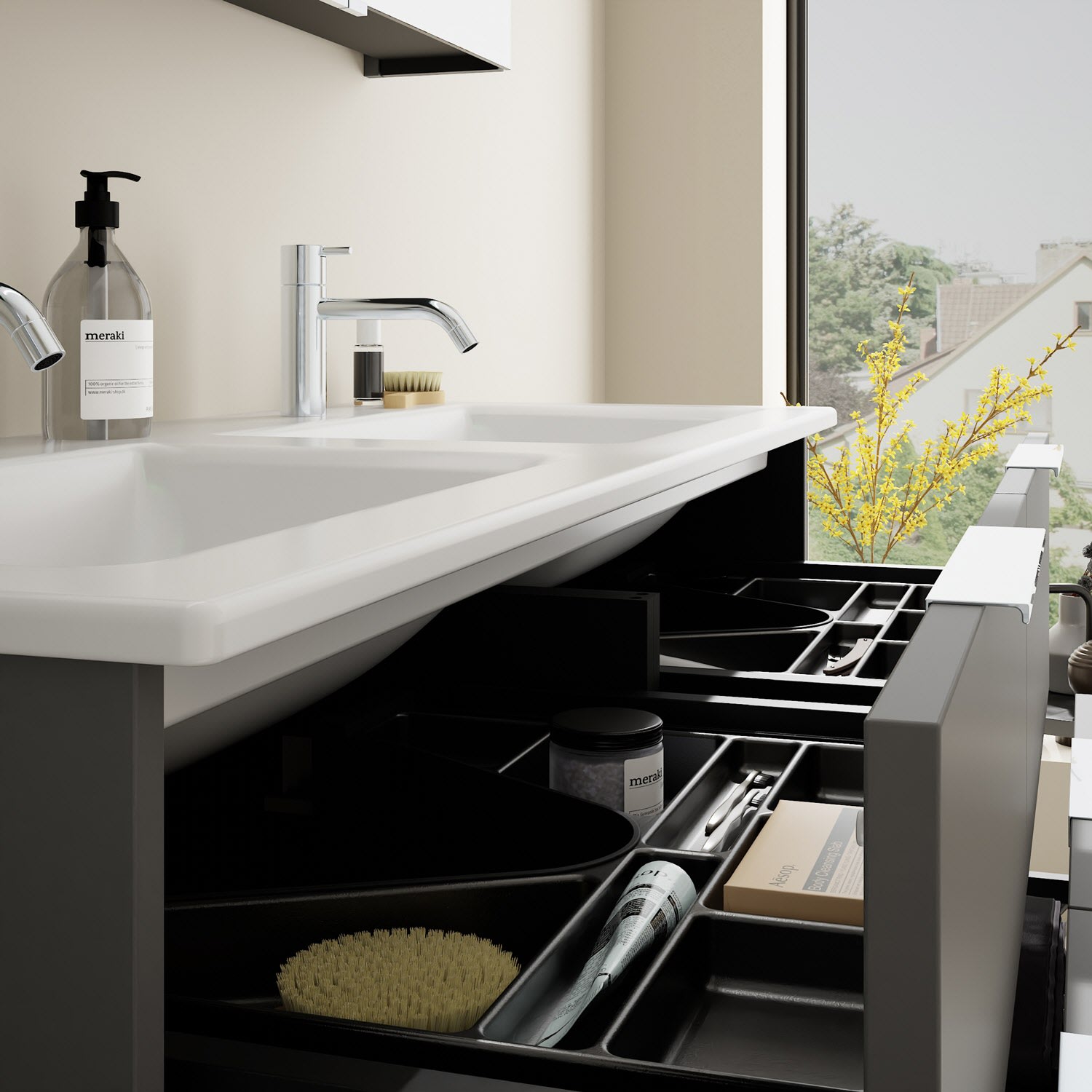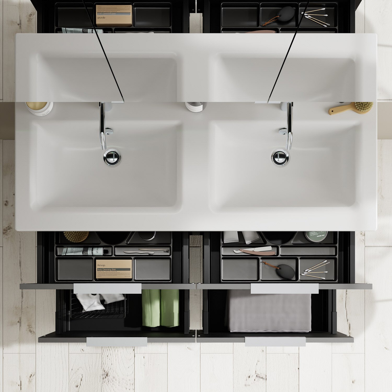 - 2 Schubladen oben, 35 cm tief, mit Siphonausschnitt und Inneneinteilung