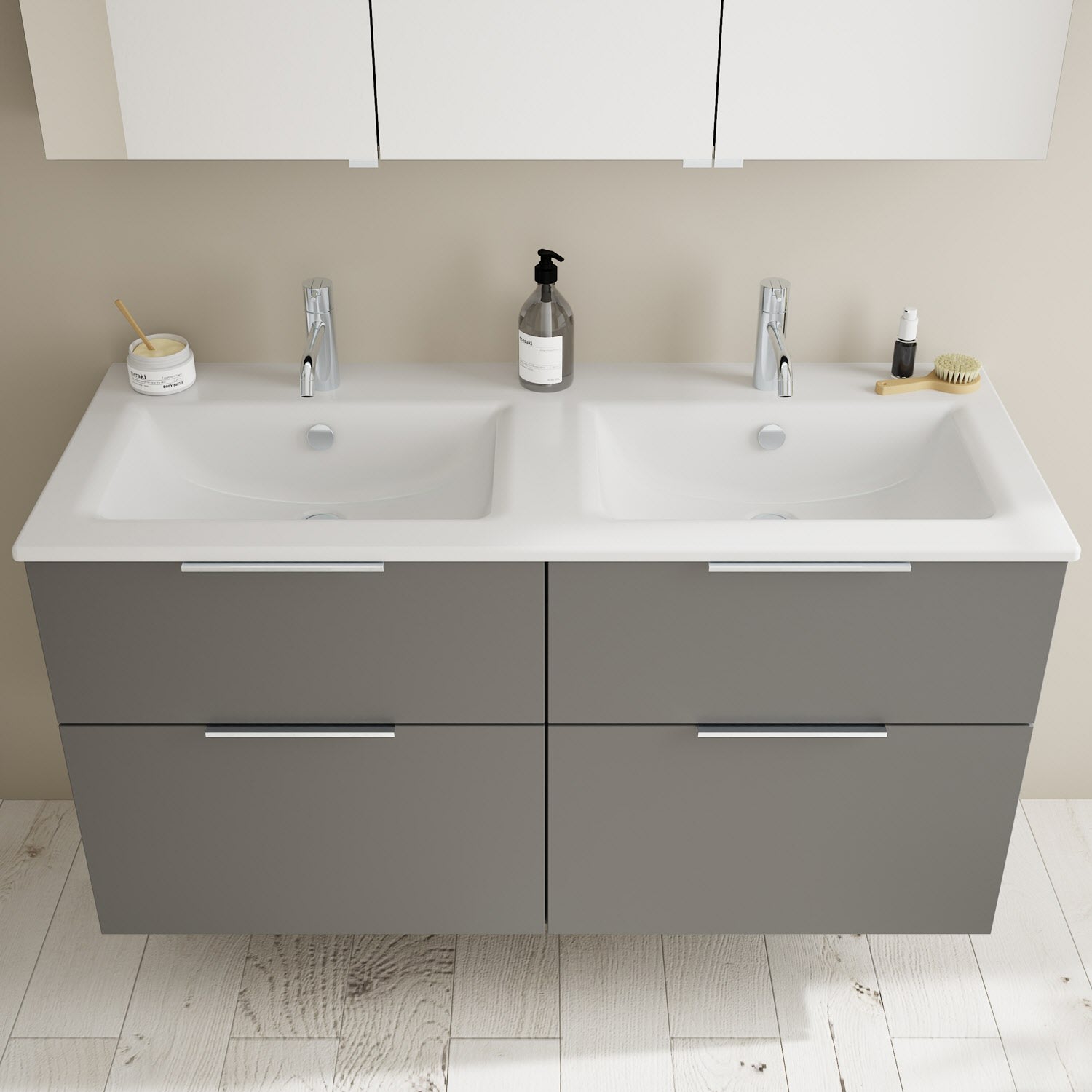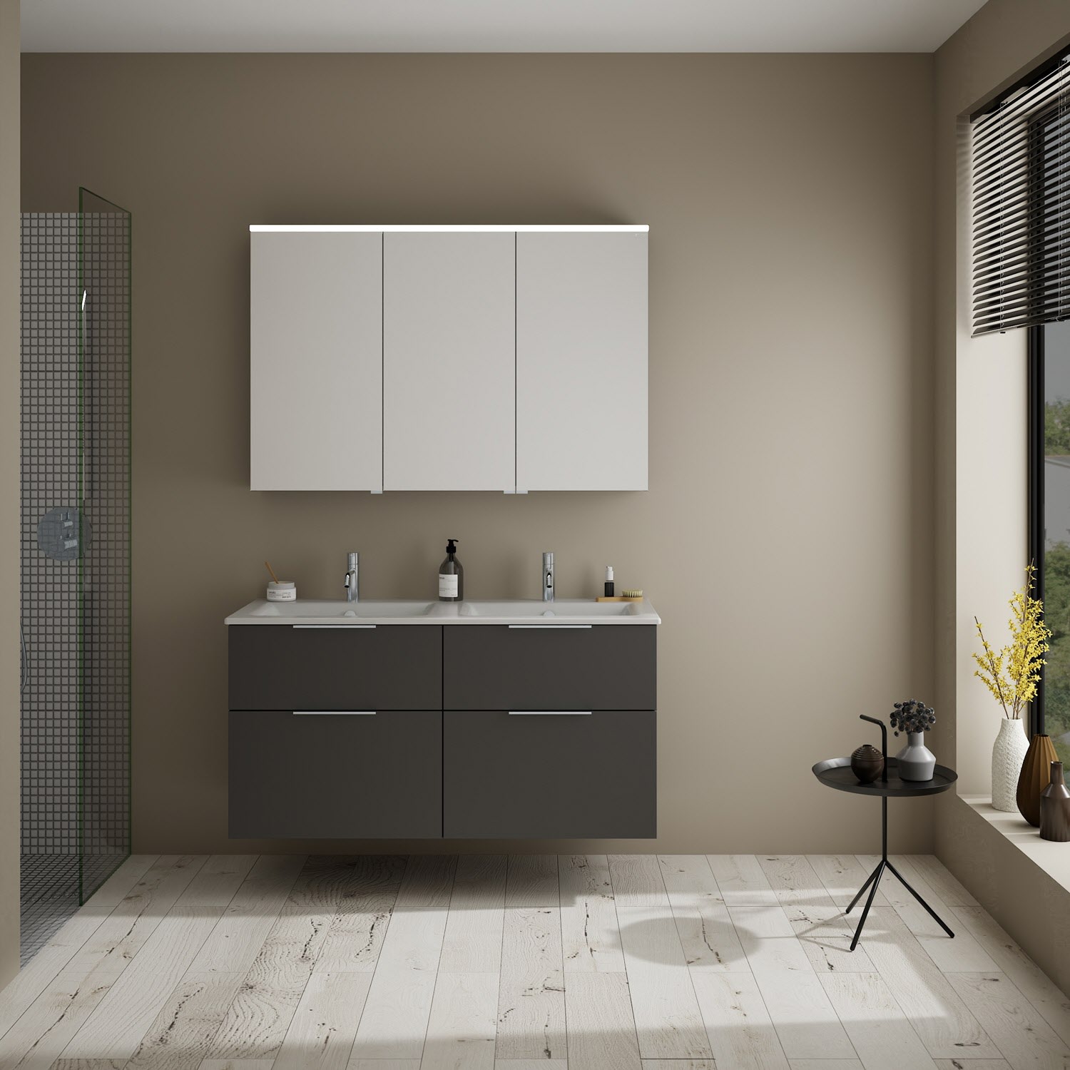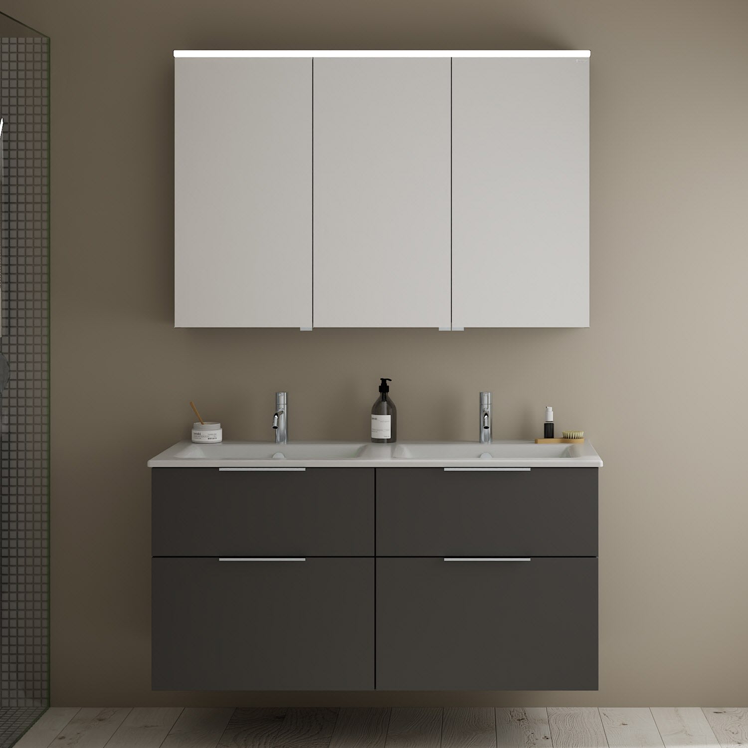 burgbad Eqio Badmöbel-Set 122 cm mit Keramik-Doppelwaschtisch Slim und Unterschrank mit Griff G0146, mit Spiegelschrank