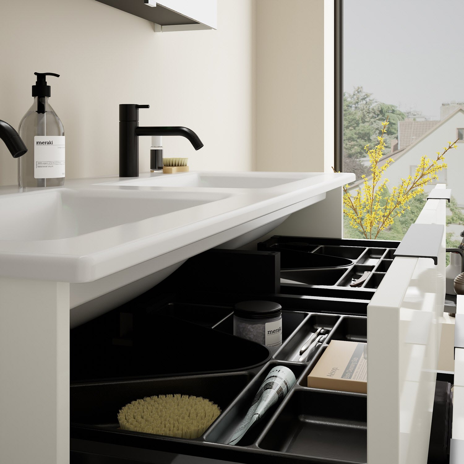 - 2 Schubladen oben, 35 cm tief, mit Siphonausschnitt und Inneneinteilung