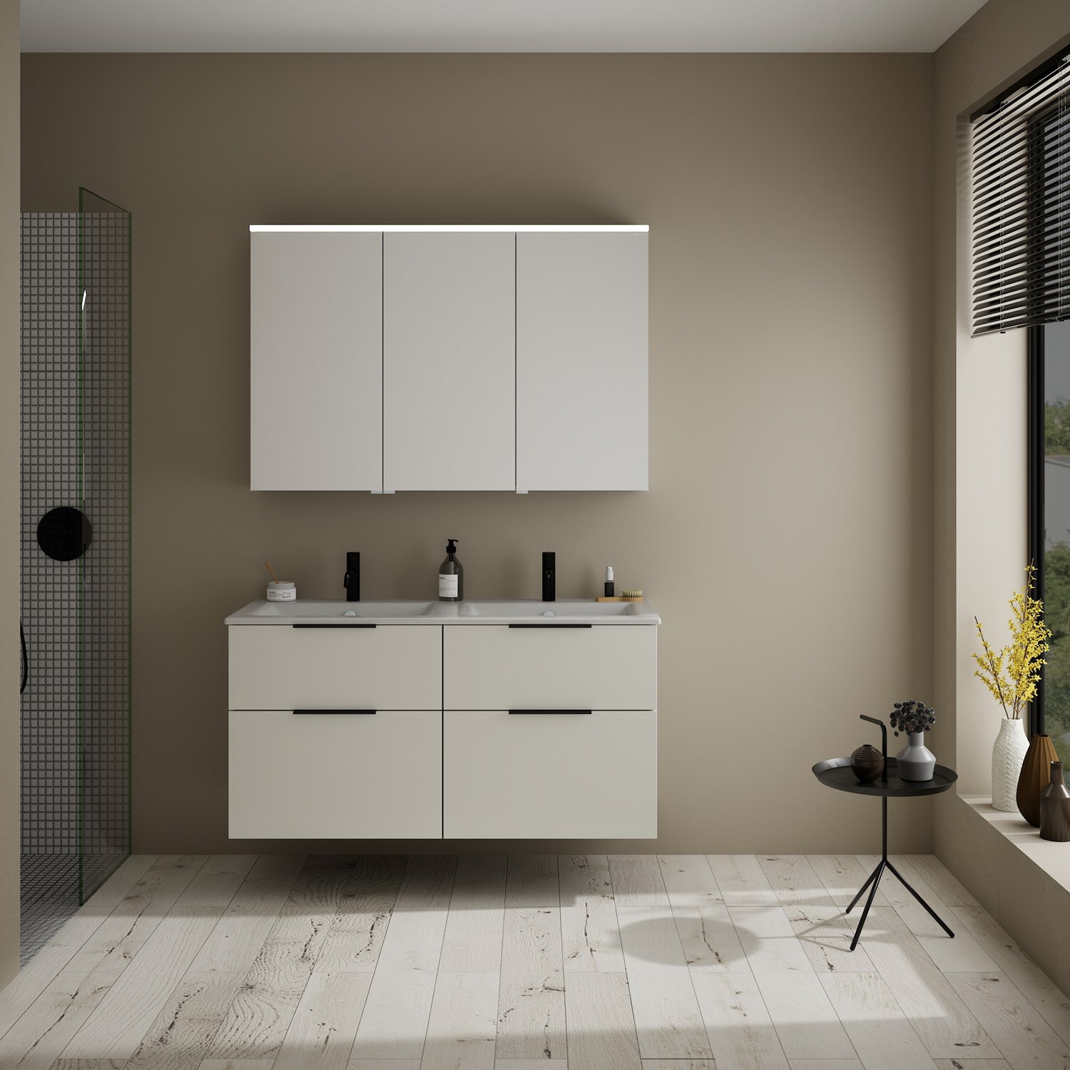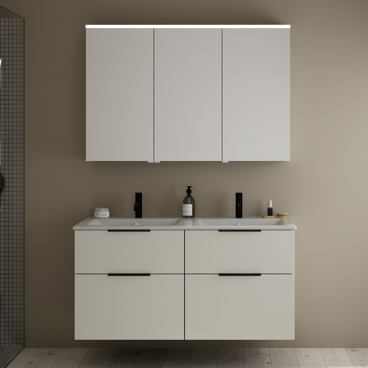 burgbad Eqio Badmöbel-Set 122 cm mit Keramik-Doppelwaschtisch Slim und Unterschrank mit Griff G0200, mit Spiegelschrank