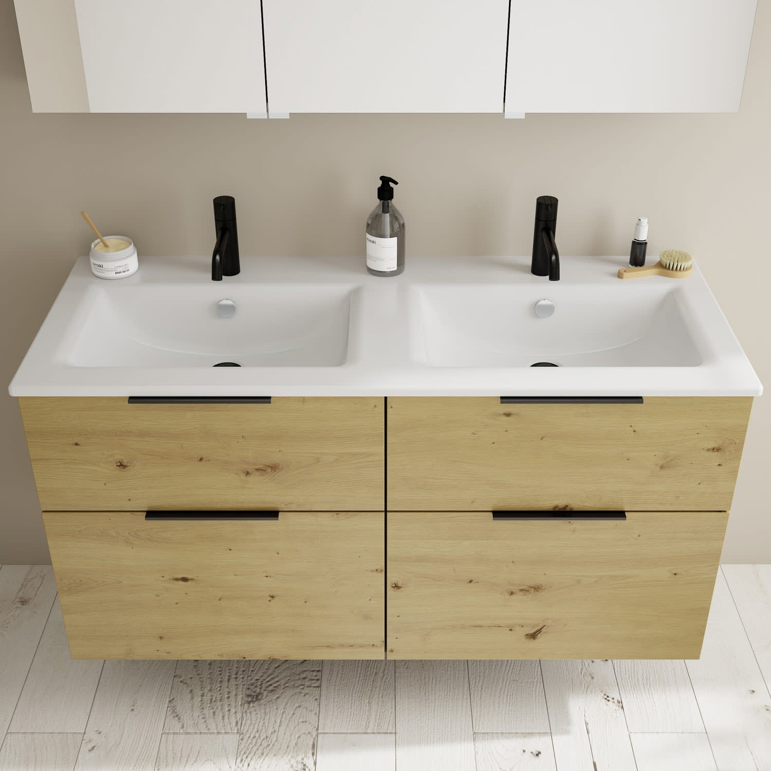 - 2 Schubladen oben, 35 cm tief, mit Siphonausschnitt und Inneneinteilung