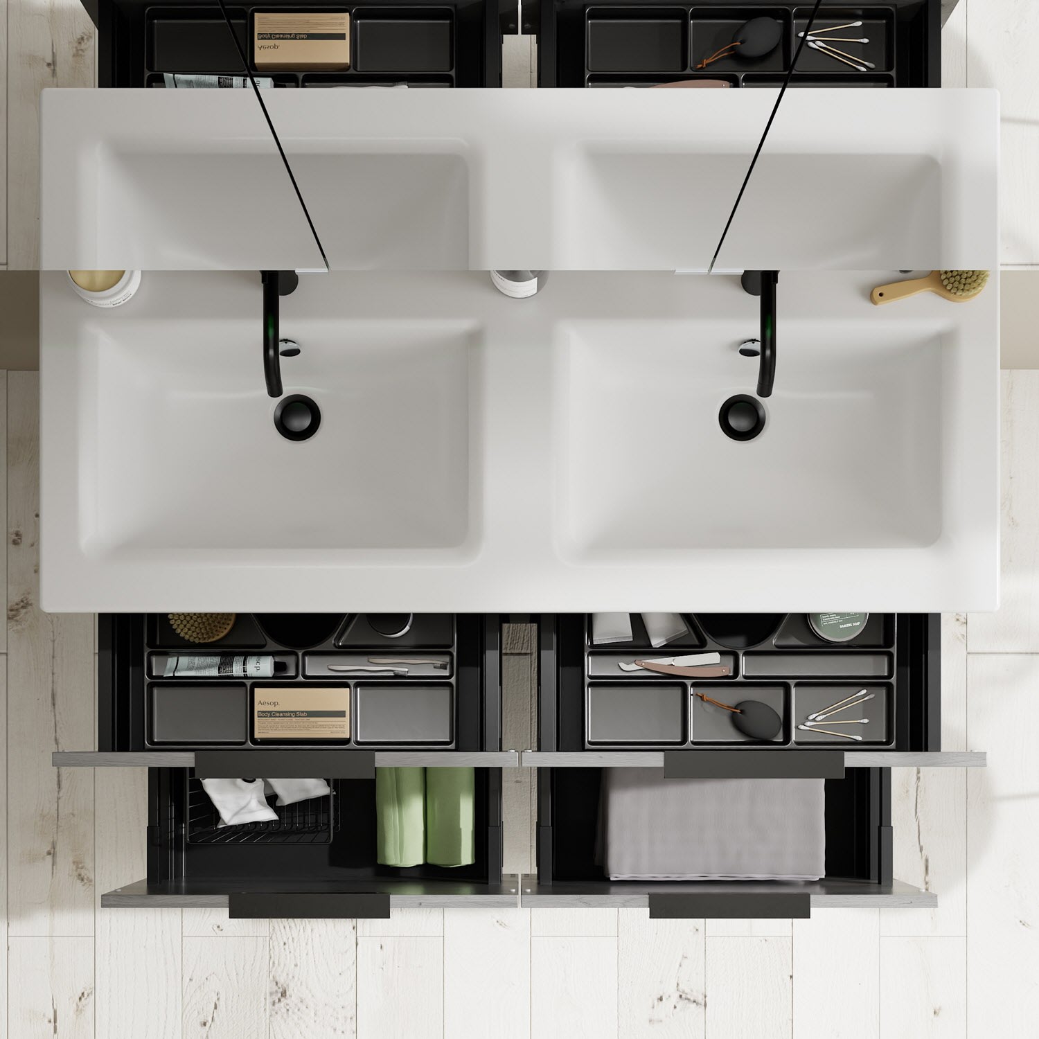 - 2 Schubladen oben, 35 cm tief, mit Siphonausschnitt und Inneneinteilung