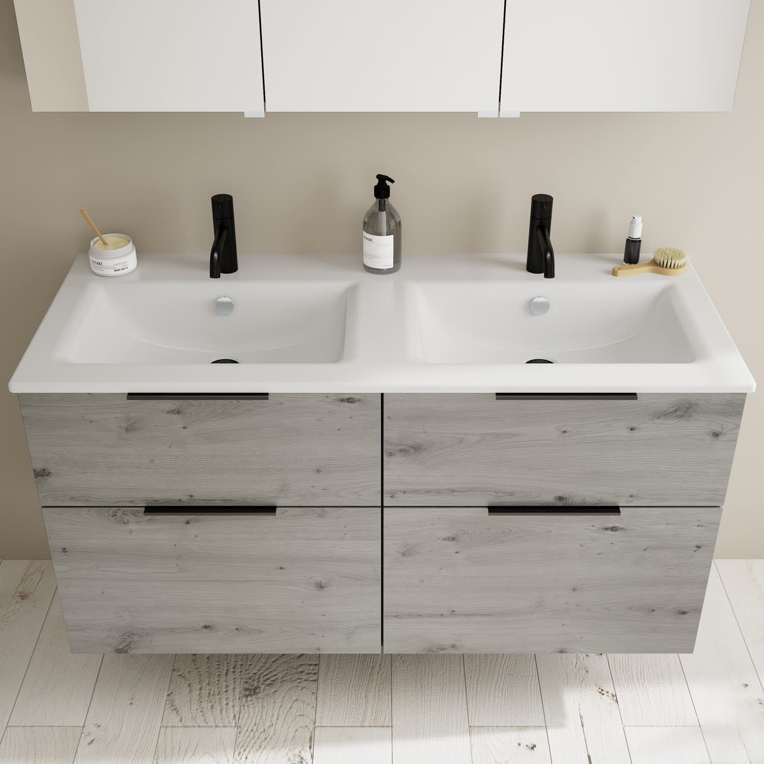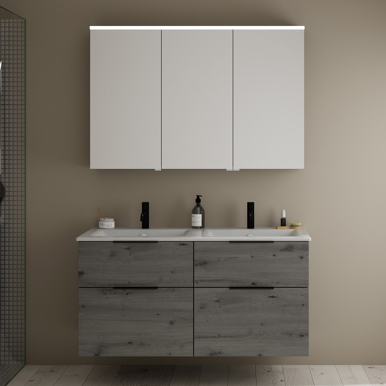 burgbad Eqio Badmöbel-Set 122 cm mit Keramik-Doppelwaschtisch Slim und Unterschrank mit Griff G0200, mit Spiegelschrank