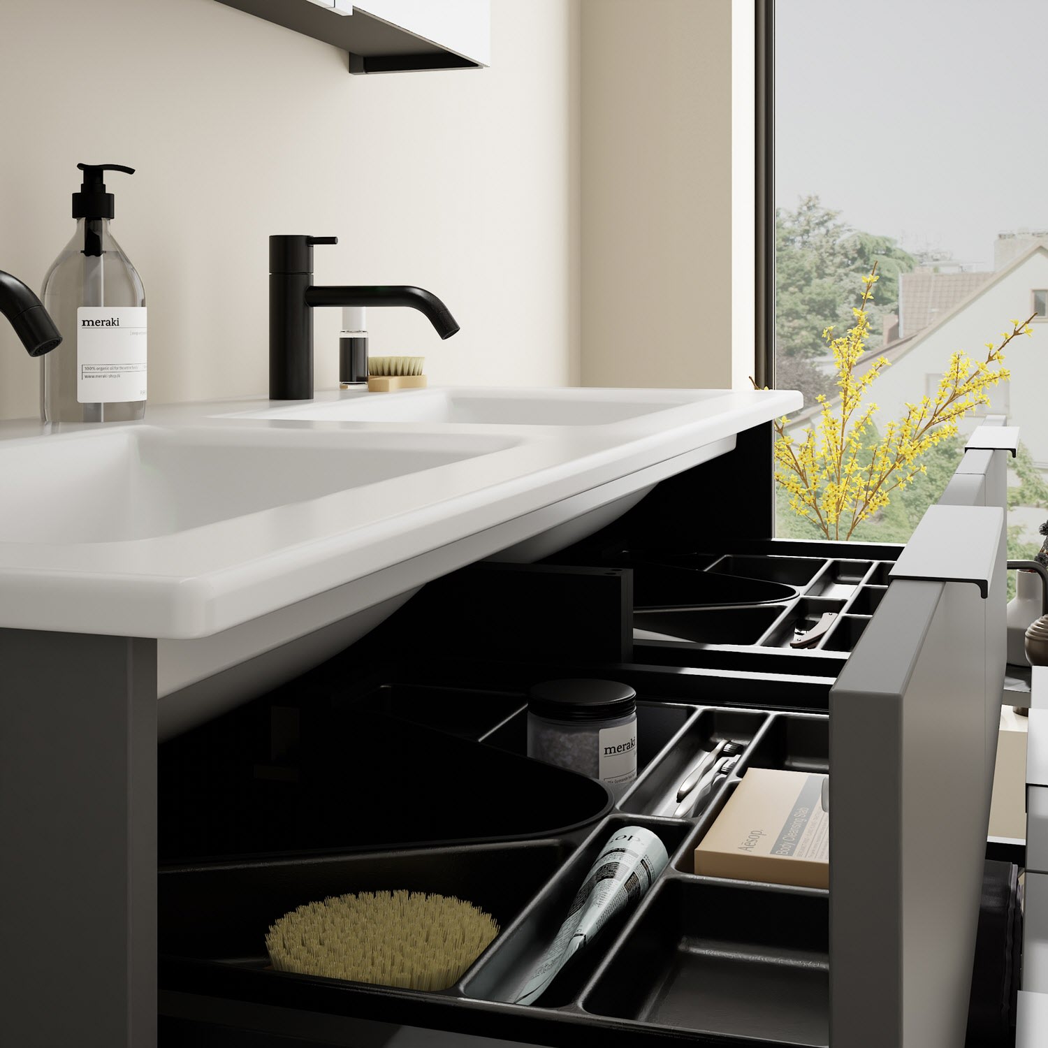 - 2 Schubladen oben, 35 cm tief, mit Siphonausschnitt und Inneneinteilung