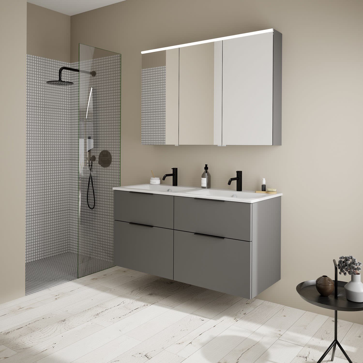 burgbad Eqio Badmöbel-Set 122 cm mit Keramik-Doppelwaschtisch Slim und Unterschrank mit Griff G0200, mit Spiegelschrank
