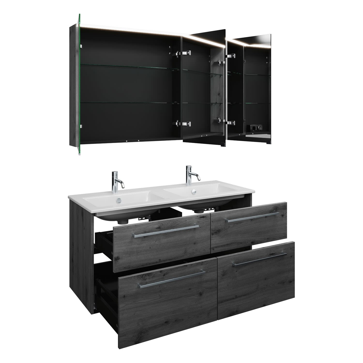 burgbad Eqio Badmöbel-Set 122 cm mit Keramik-Doppelwaschtisch Slim und Unterschrank mit Stangengriff P95, mit Spiegelschrank