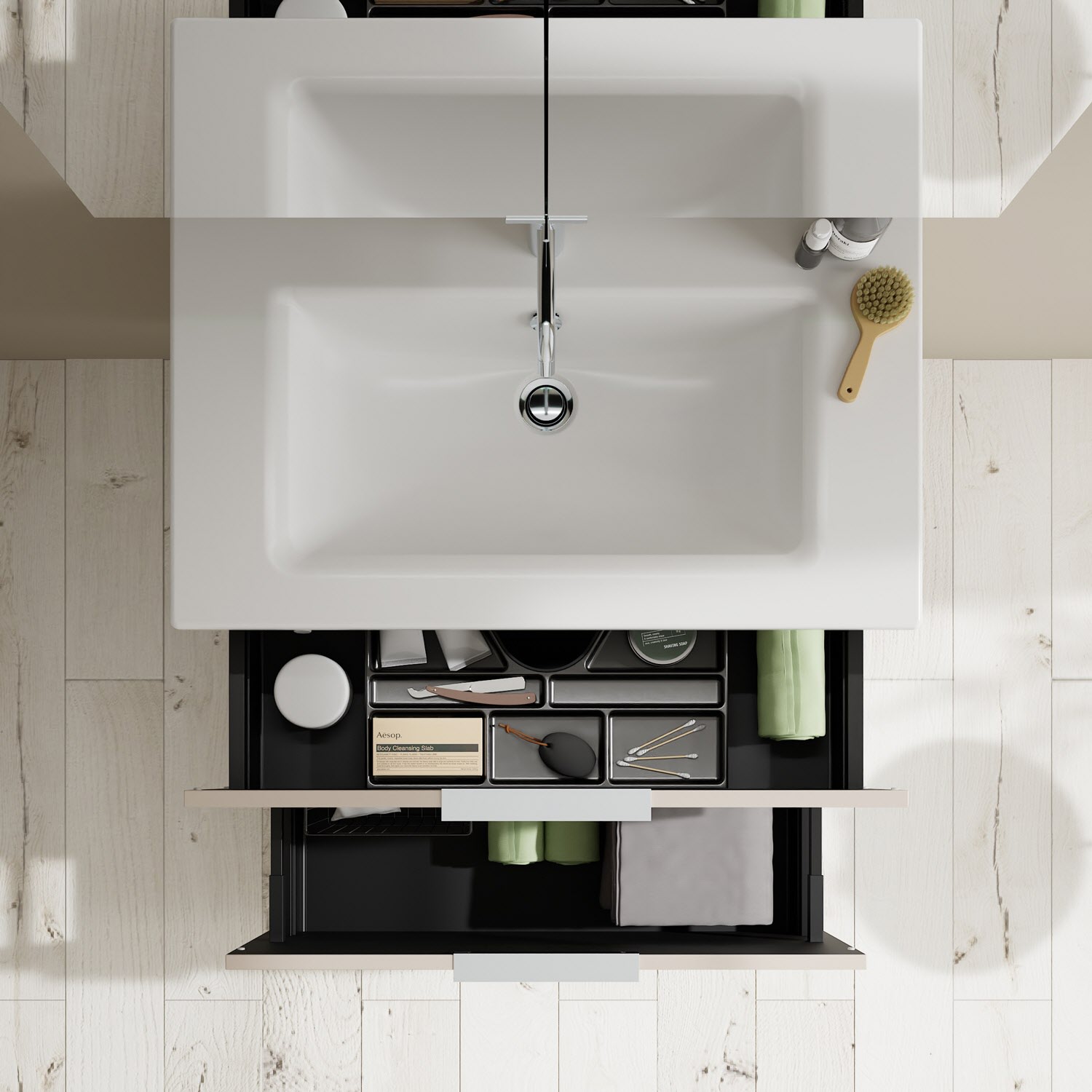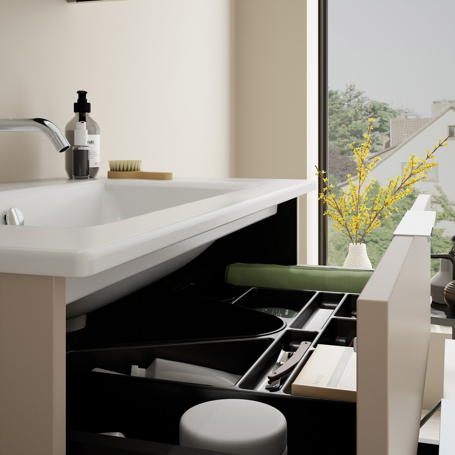 - 1 Schublade oben, 35 cm tief, mit Siphonausschnitt und Inneneinteilung