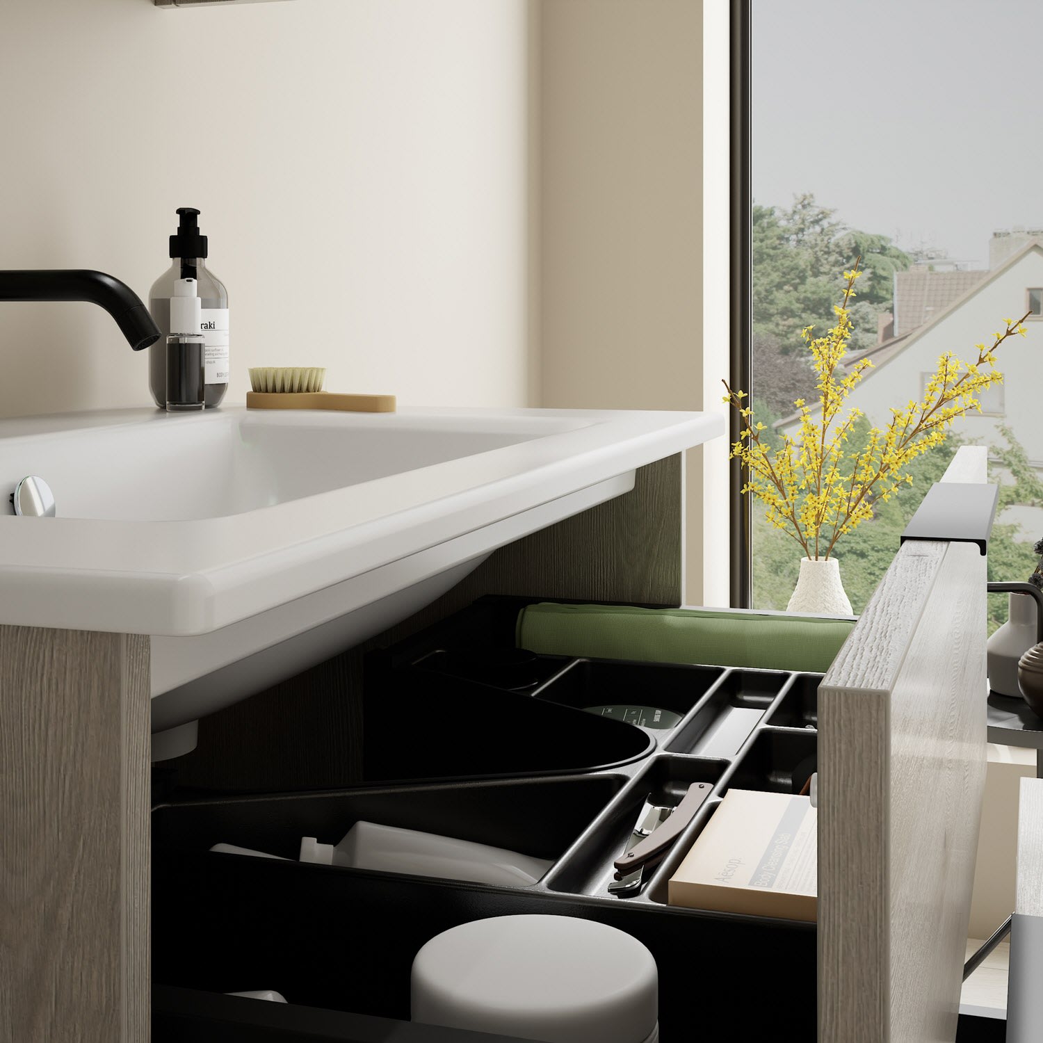 - 1 Schublade oben, 35 cm tief, mit Siphonausschnitt und Inneneinteilung
