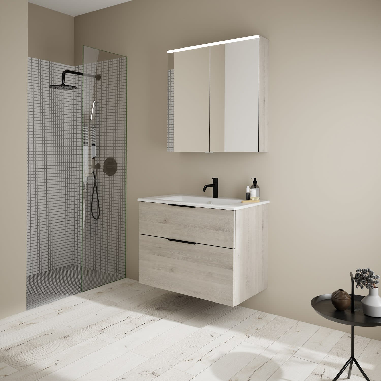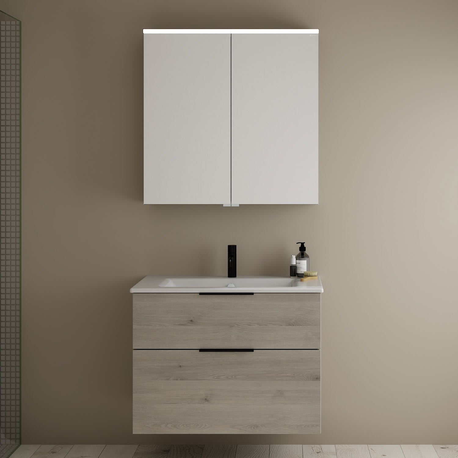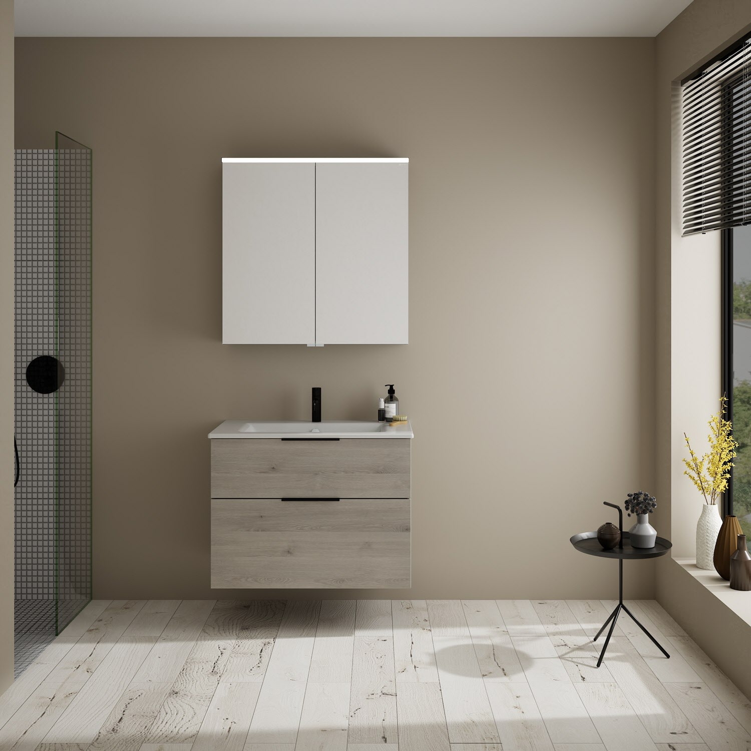 burgbad Eqio Badmöbel-Set 82 cm mit Keramik-Waschtisch Slim und Unterschrank mit Griff G0200, mit Spiegelschrank