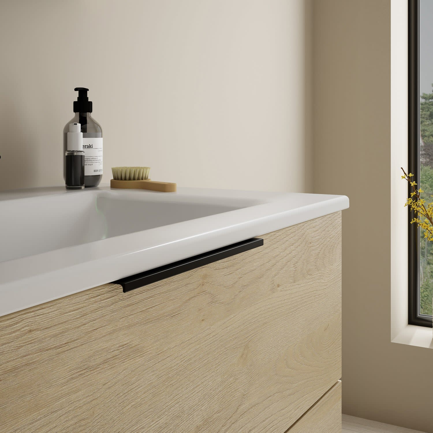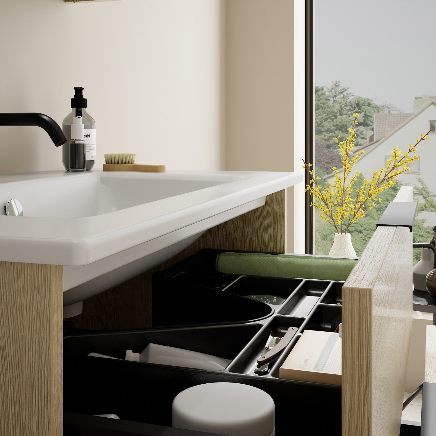 - 1 Schublade oben, 35 cm tief, mit Siphonausschnitt und Inneneinteilung