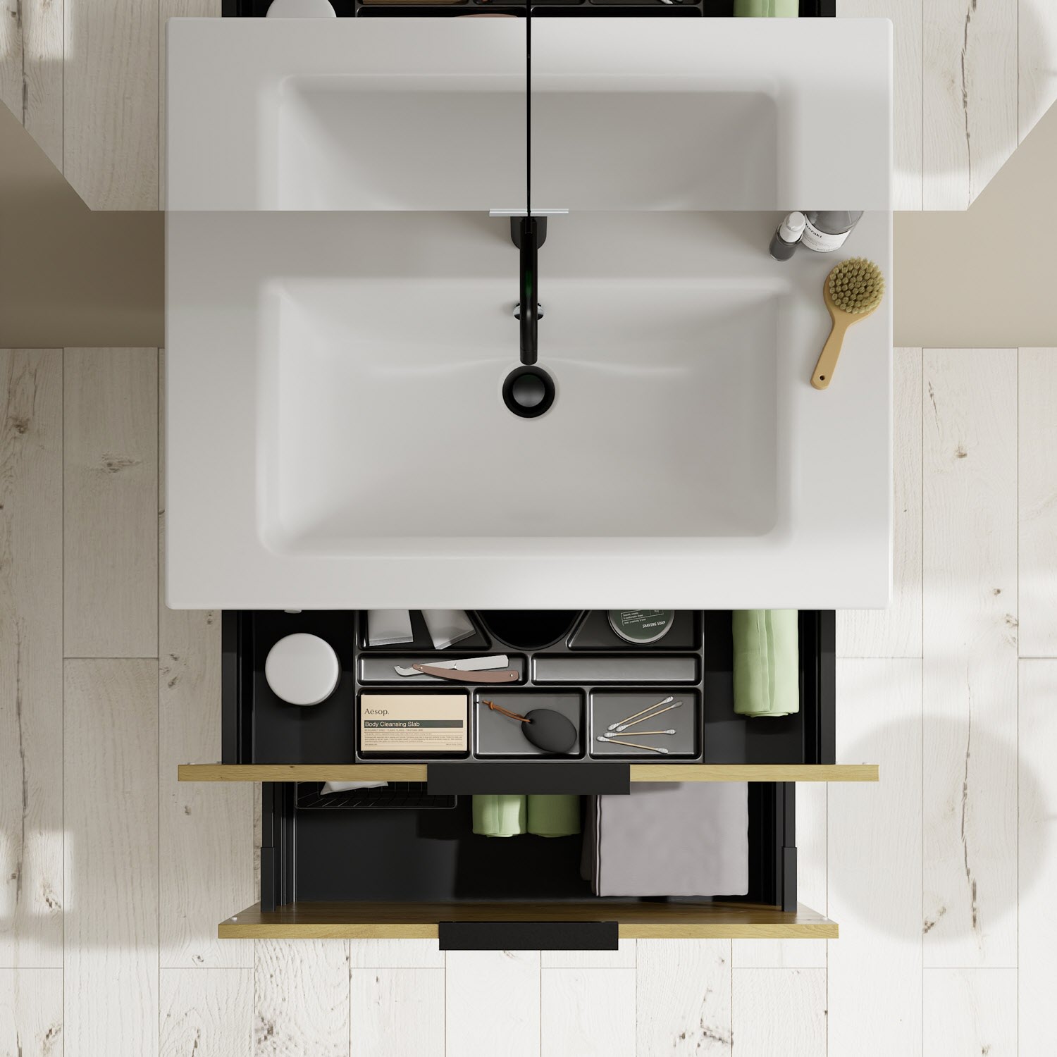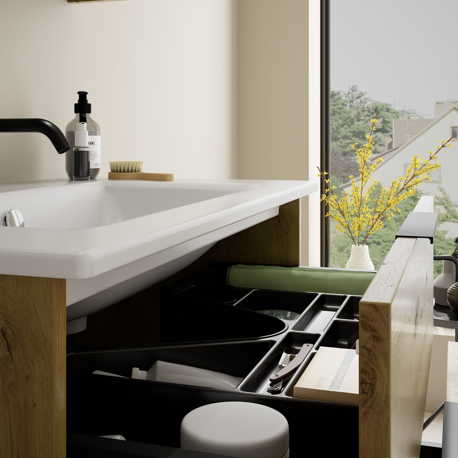 - 1 Schublade oben, 35 cm tief, mit Siphonausschnitt und Inneneinteilung