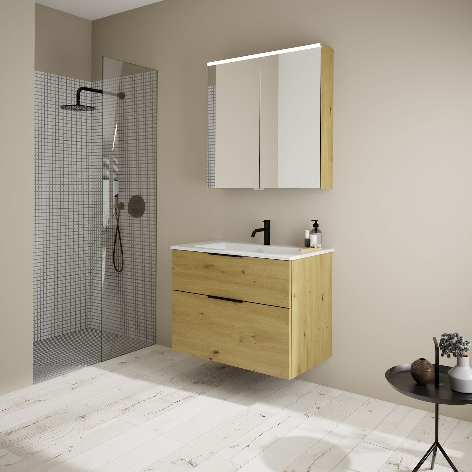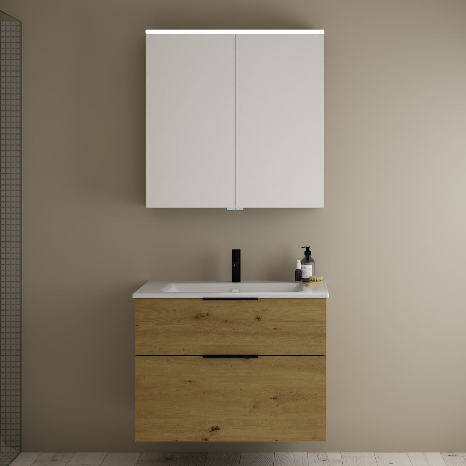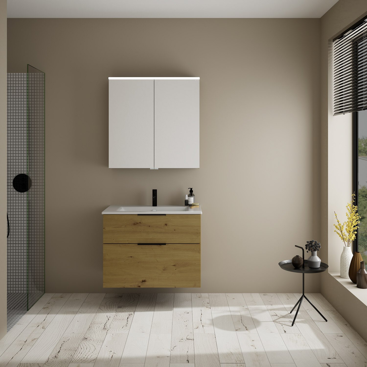 burgbad Eqio Badmöbel-Set 82 cm mit Keramik-Waschtisch Slim und Unterschrank mit Griff G0200, mit Spiegelschrank