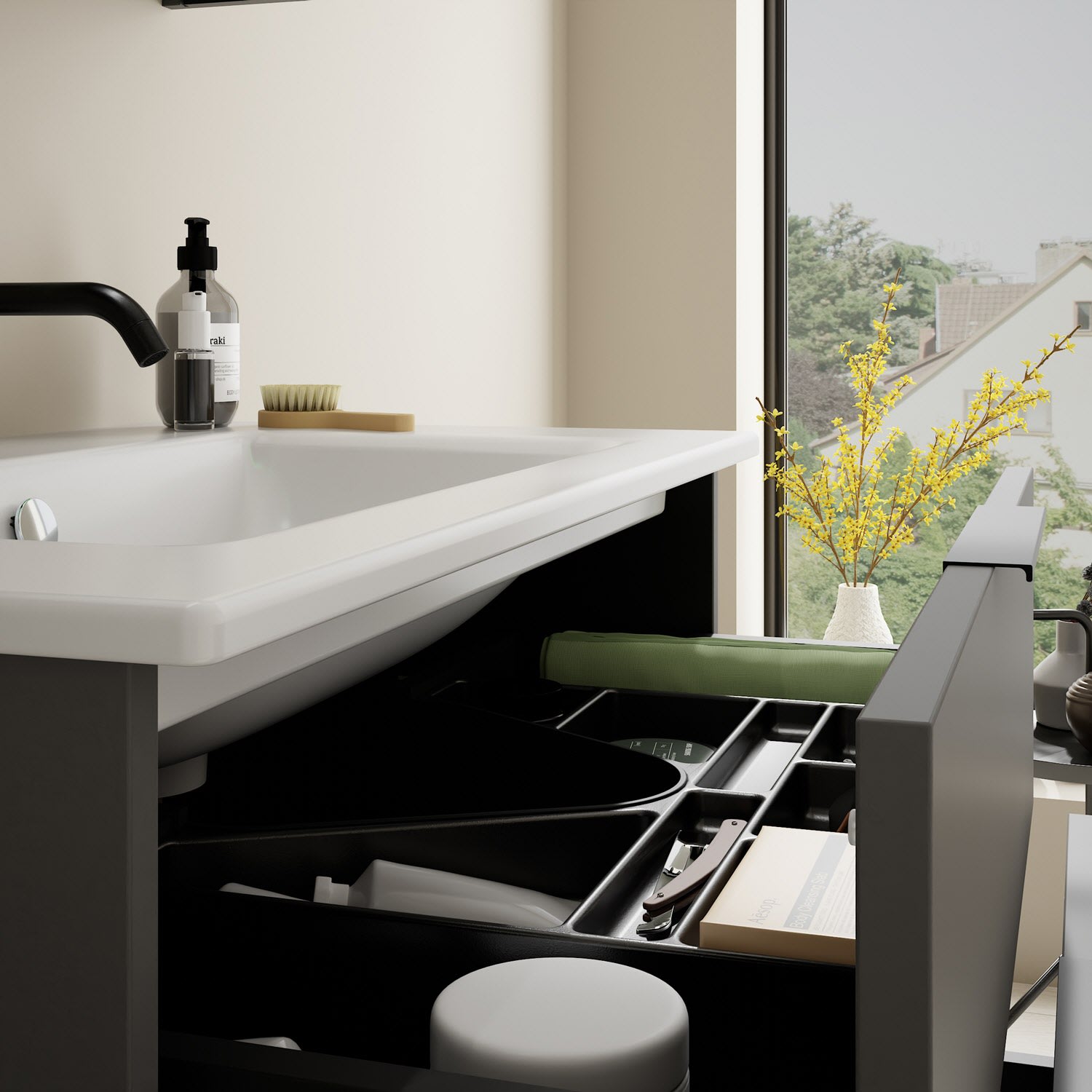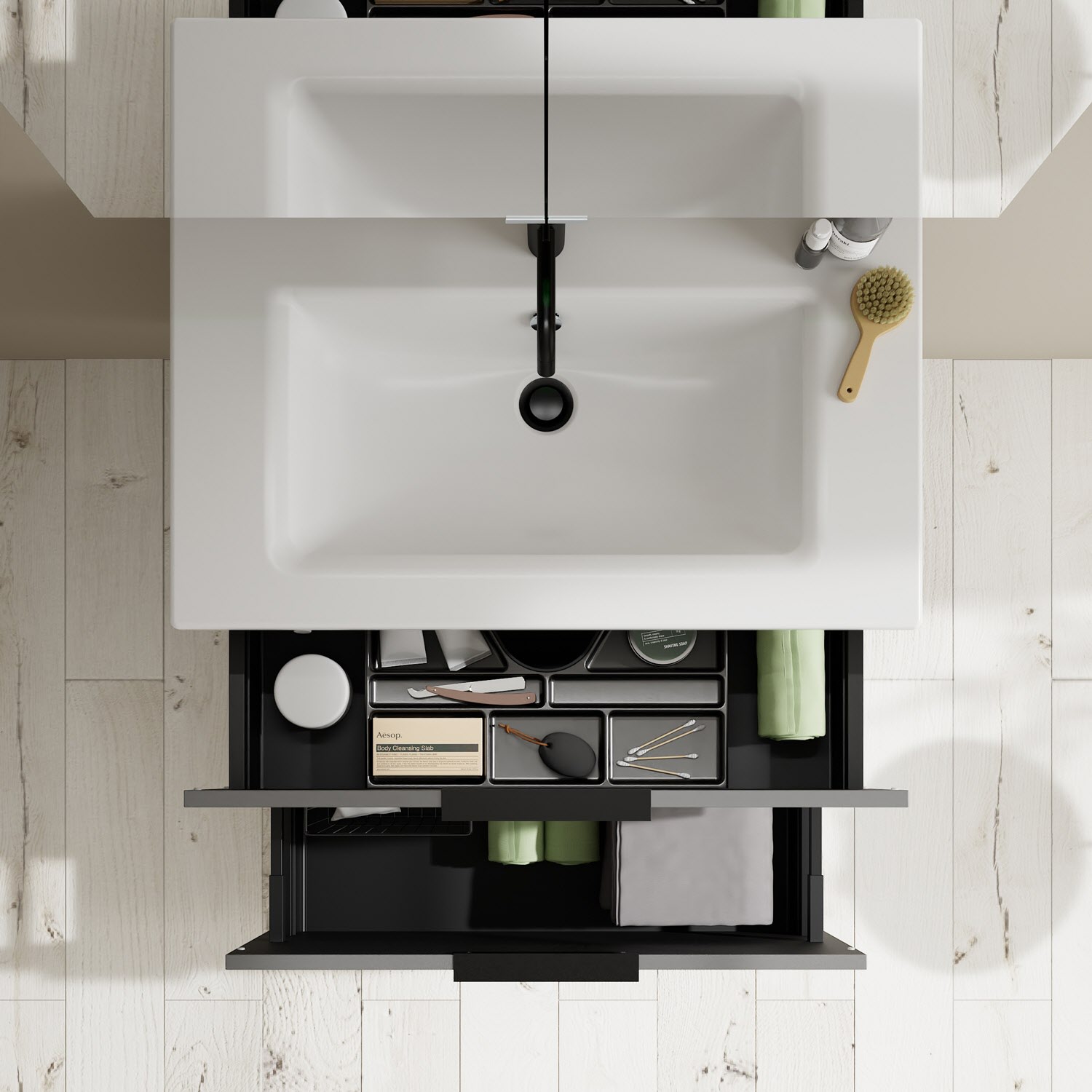- 1 Schublade oben, 35 cm tief, mit Siphonausschnitt und Inneneinteilung