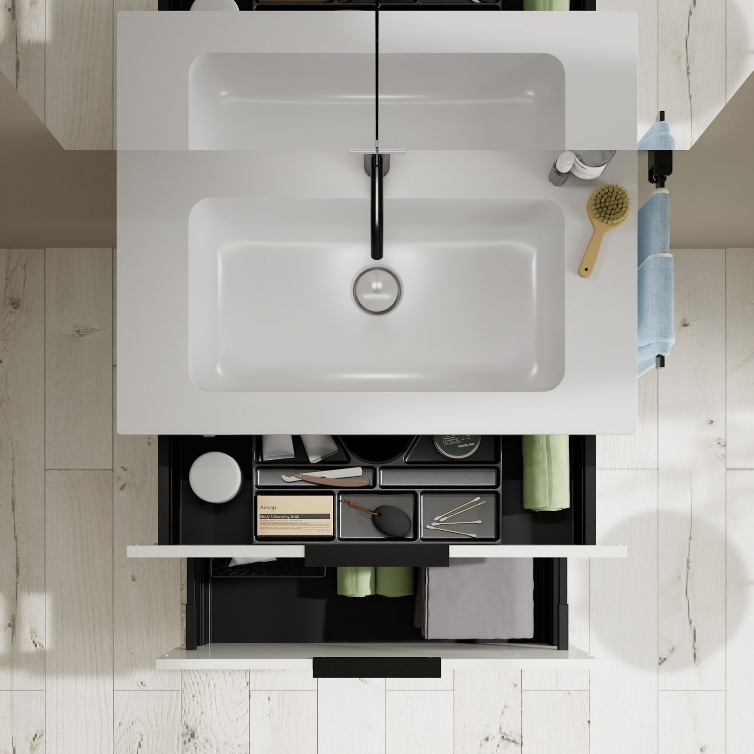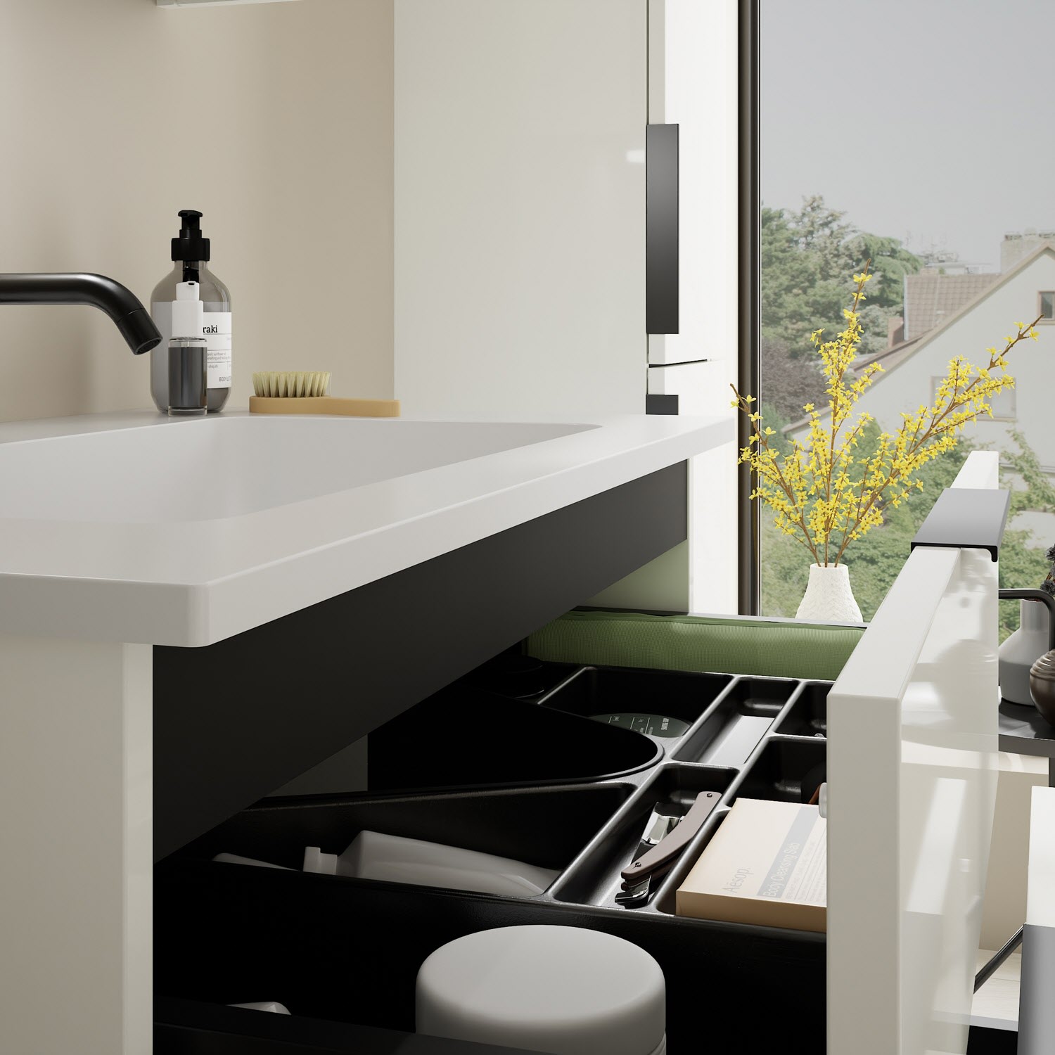 - 1 Schublade oben, 35 cm tief, mit Siphonausschnitt und Inneneinteilung