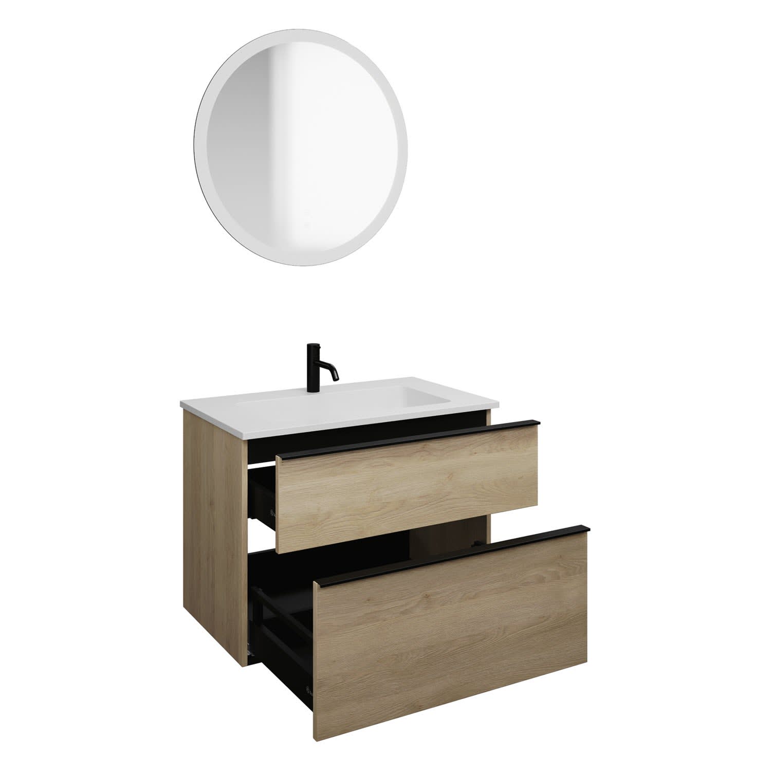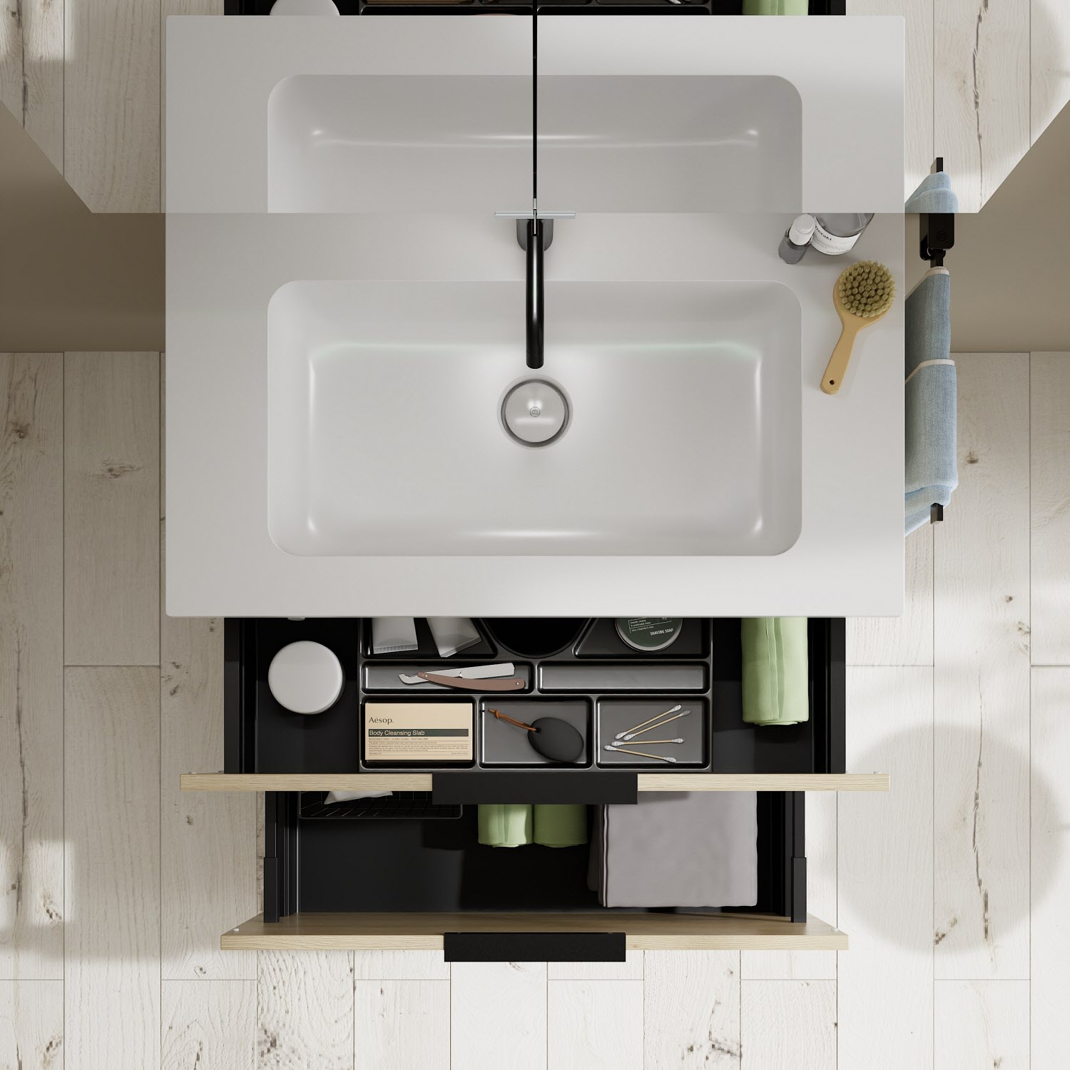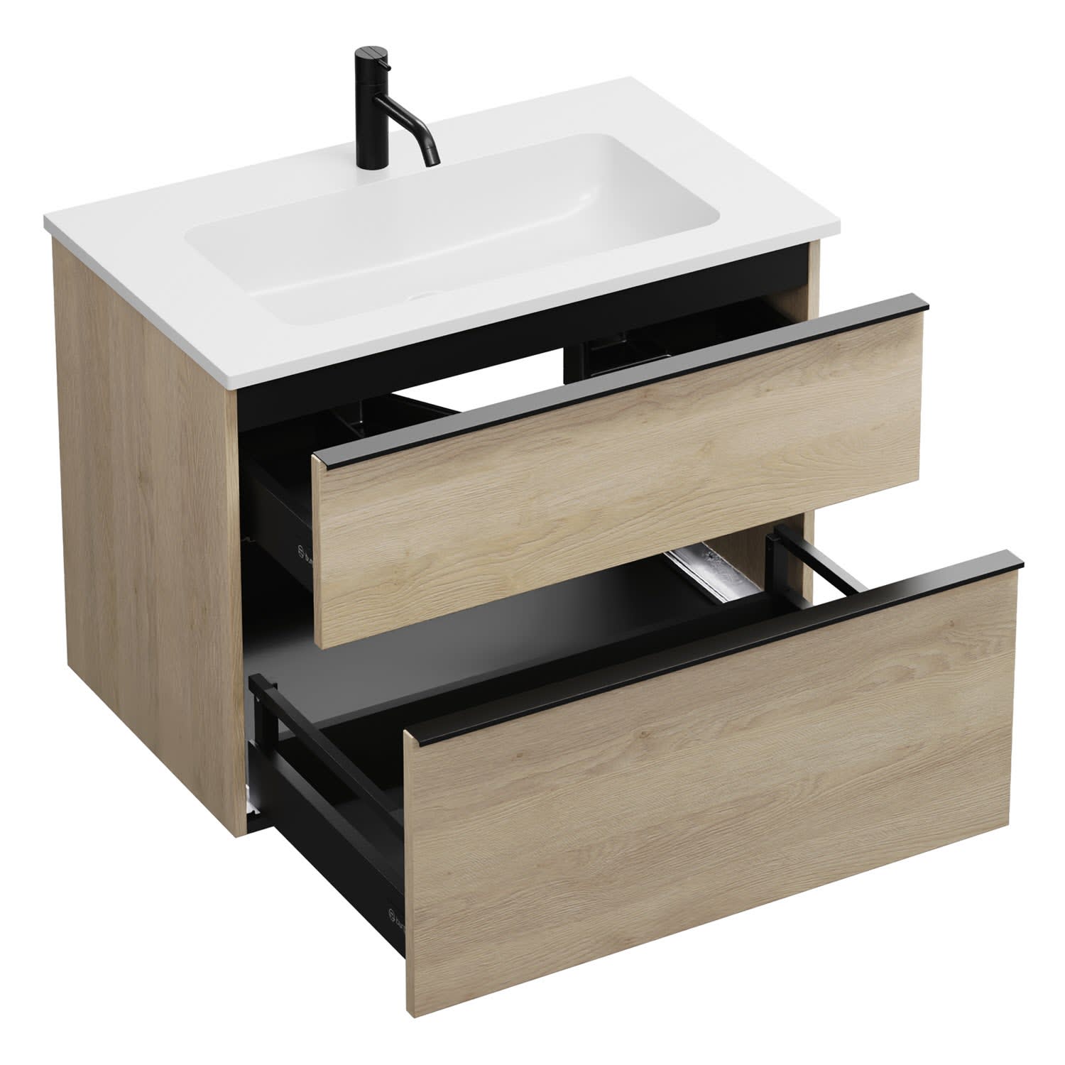 - 1 Schublade oben, 35 cm tief, mit Siphonausschnitt und Inneneinteilung
